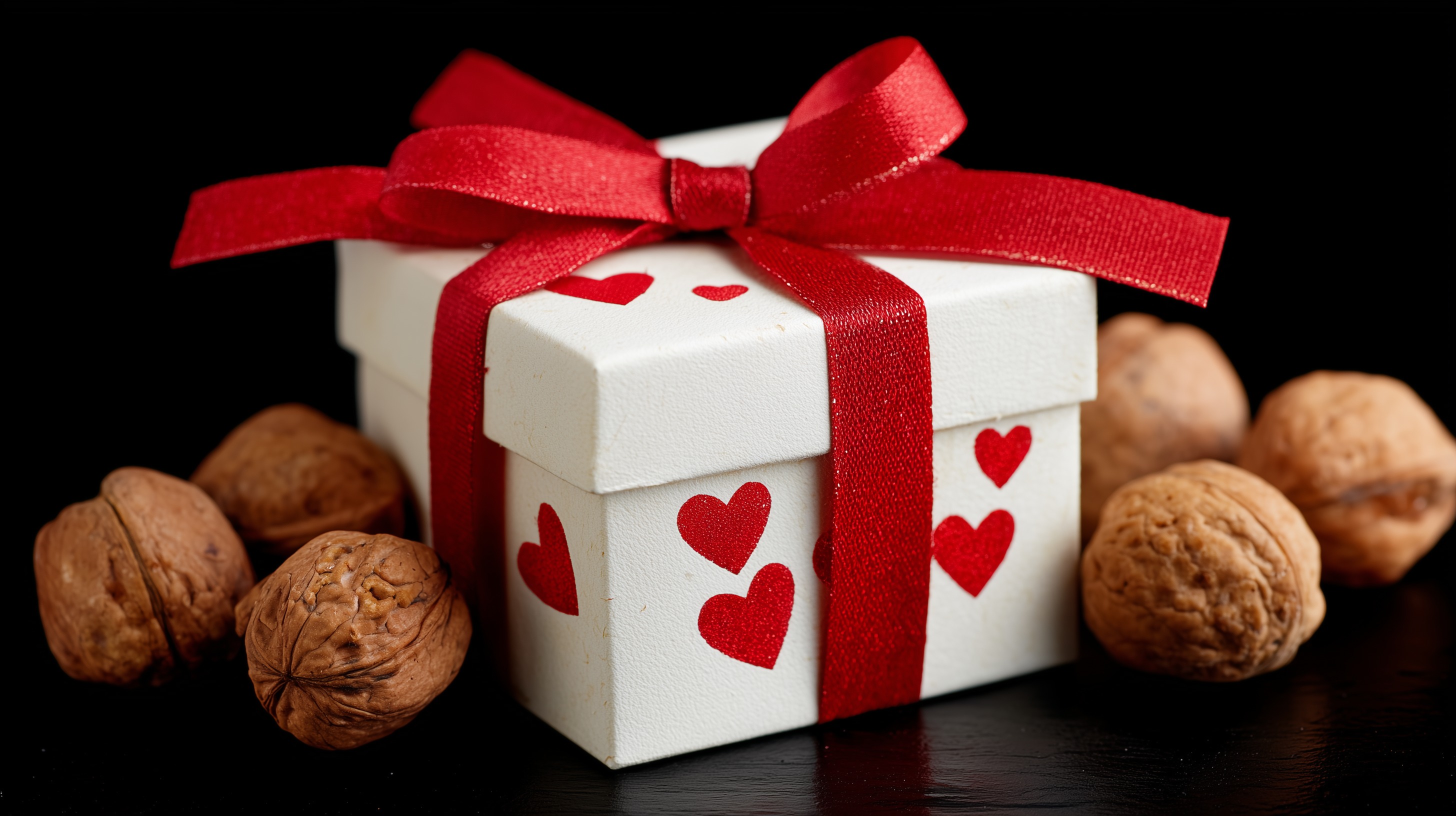 Das Foto zeigt eine weiße Geschenkbox mit einem roten Geschenkband und roten Herzen darauf. Neben der Geschenkbox befinden sich einige Walnüsse, die den romantischen und feierlichen Charakter des Bildes unterstreichen. Die dunkle Hintergrundfarbe lässt die Geschenkbox und die Nüsse kontrastreich und elegant hervortreten. Diese Komposition ist ideal für den Einsatz in Blogs, sozialen Medien oder Präsentationen zum Thema Liebe, Valentinstag oder besondere Anlässe. Die Farbgebung, Form und Anordnung der Elemente wecken Gefühle der Freude, Romantik und Feierlichkeit beim Betrachter.