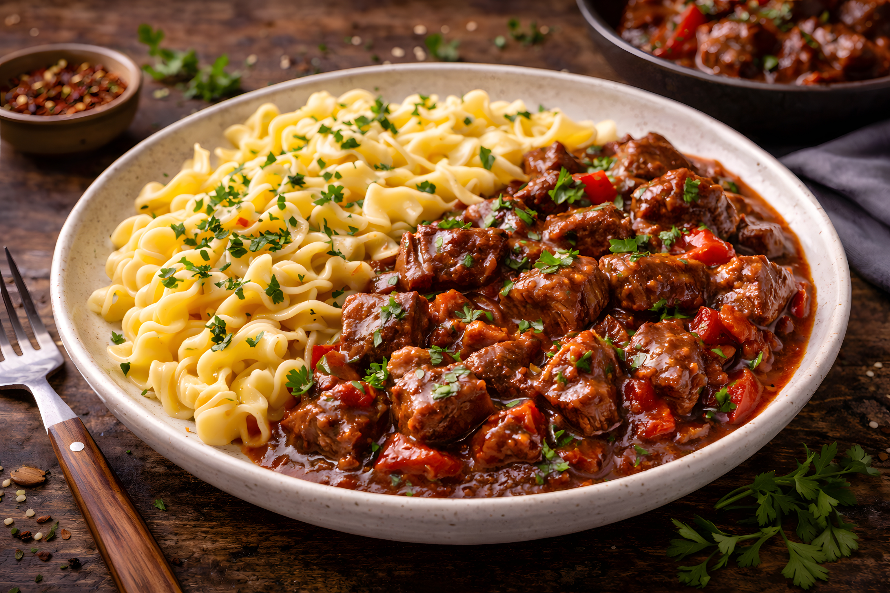 Dieses verlockende Foto präsentiert ein leckeres Gulasch-Gericht mit Nudeln - eine klassische, aber äußerst schmackhafte Kombination. Das Bild zeigt einen Teller, gefüllt mit zarten Gulasch-Stücken in einer appetitlich würzigen Sauce, die von feinen Paprikawürfeln und frischer Petersilie garniert sind. Daneben liegen luftige Nudeln, die perfekt als Beilage zu dem herzhaften Hauptgericht dienen.