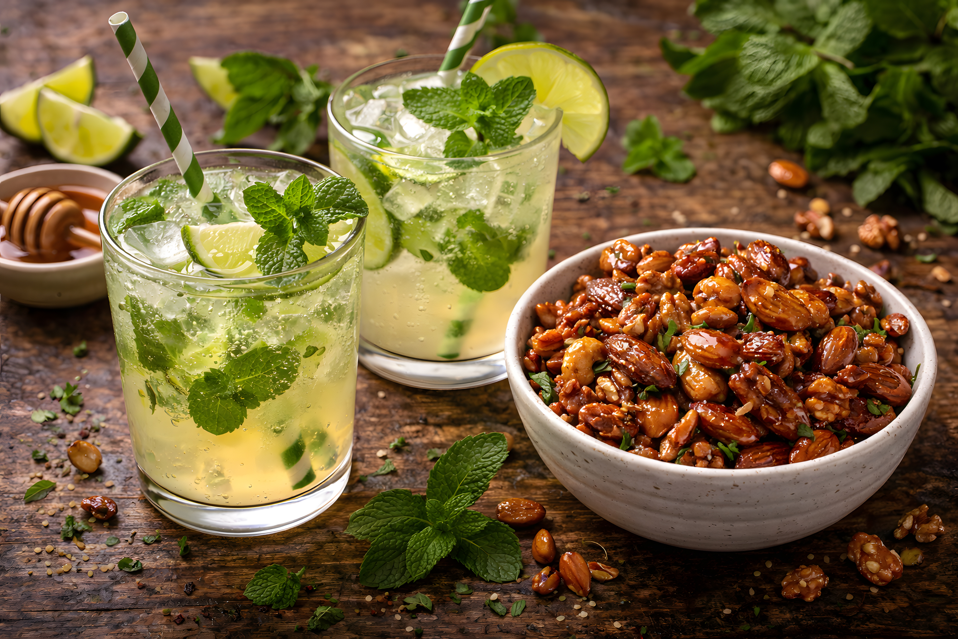 Dieses Foto zeigt ein erfrischendes Minz-Limetten-Getränk mit karamellisierten Nüssen. Der Drink ist in zwei Gläsern mit Eiswürfeln und Strohhalmen serviert. Neben den Gläsern sind frische Minzblätter, Limettenscheiben und geröstete Nüsse zu sehen. Die Präsentation wirkt sommerlich, gesund und einladend. Das Foto eignet sich hervorragend für den Einsatz in Lifestyle-Blogs, Getränke-Präsentationen oder Rezeptsammlungen in sozialen Medien. Die natürlichen Farben und die ausgewogene Komposition machen das Bild zu einem stimmungsvollen Blickfang.