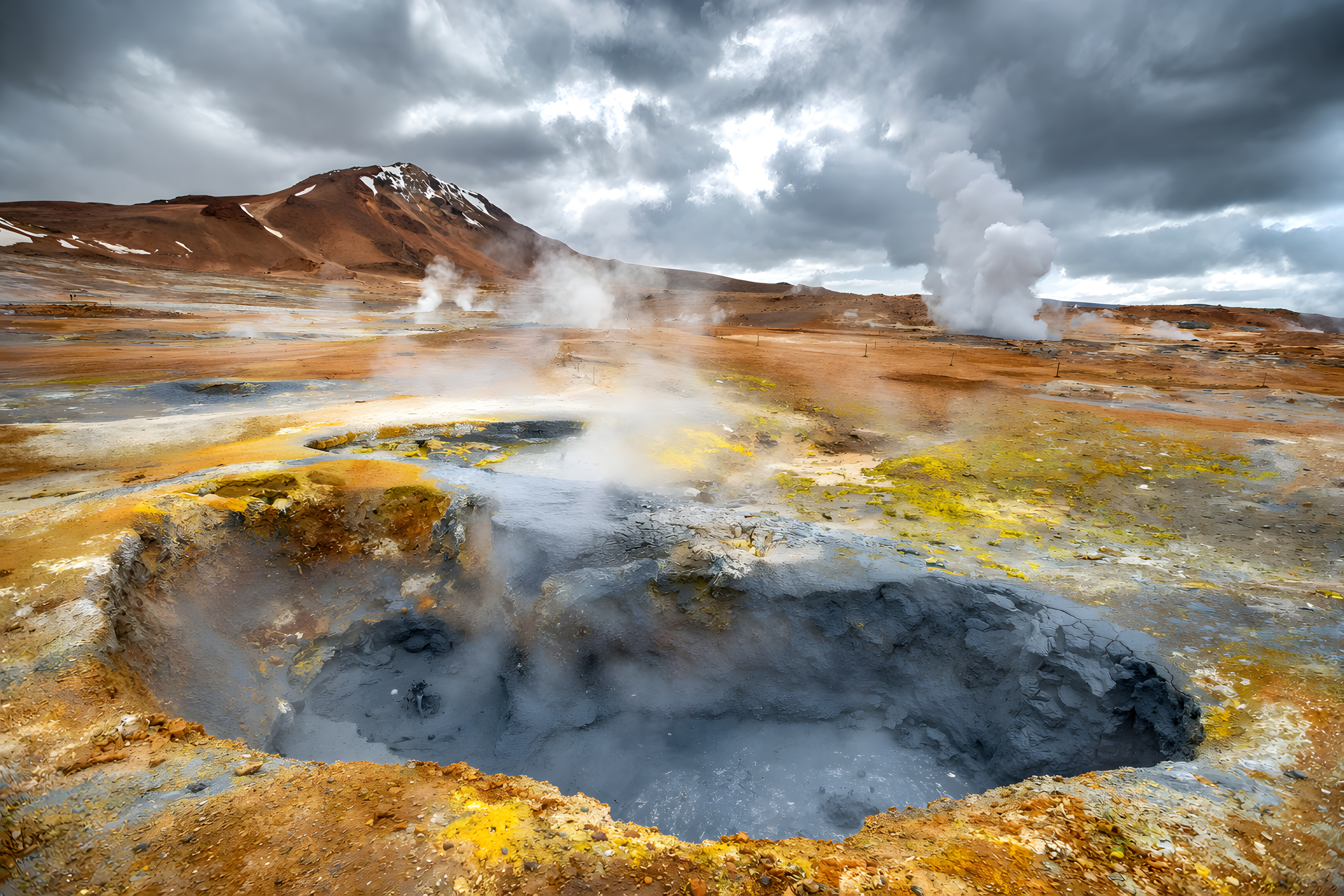 Dieses Foto zeigt eine beeindruckende geothermale Landschaft in Island. Im Vordergrund sind dampfende Thermalquellen und bunte Mineralablagerungen am Erdboden zu sehen, die durch die intensive vulkanische Aktivität in der Region entstanden sind. Im Hintergrund ragen schneebedeckte Berge in den düsteren, wolkenverhangenen Himmel. Die Szenerie ist von einer dramatischen, stimmungsvollen Atmosphäre geprägt und vermittelt die Faszination der rauen, vulkanischen Natur Islands. Dieses Foto eignet sich hervorragend für die Verwendung in Blogbeiträgen, Social-Media-Kanälen oder Präsentationen zum Thema Reisen, Natur und Umwelt. Es fesselt den Betrachter mit seinen intensiven Farben, der besonderen Geologie und der wilden Schönheit der isländischen Landschaft.