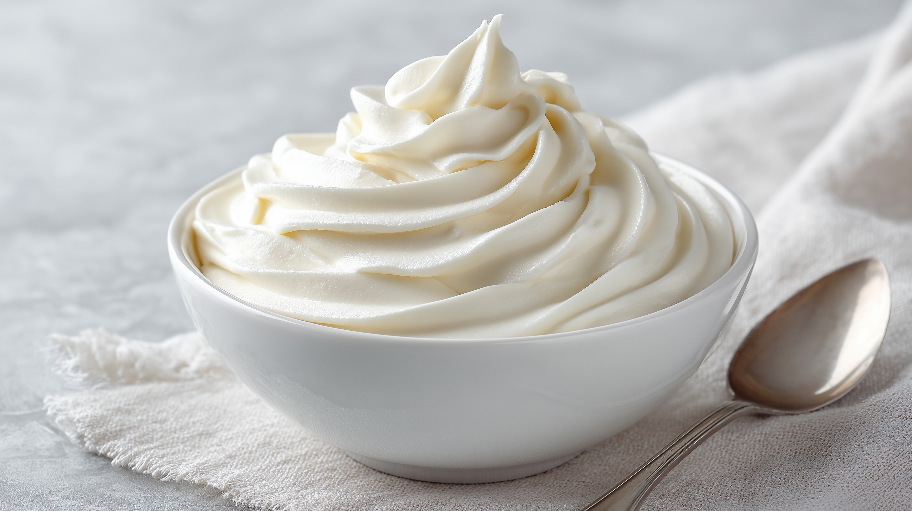 Das Foto zeigt eine weiße Porzellanschüssel, gefüllt mit einer cremig-schaumigen Dessertcreme. Die Oberfläche ist leicht gewellt und glänzend, was auf eine cremige, luftige Textur hindeutet. Der Löffel im Vordergrund verstärkt den Eindruck eines leckeren, delikaten Desserts. Die Farbgebung in Weiß und Creme verleiht dem Bild eine elegant-ruhige Ausstrahlung. Diese bildhafte Darstellung eines köstlichen Desserts eignet sich hervorragend für den Einsatz in Rezeptbüchern, Foodblogs oder Präsentationen rund um das Thema Gastronomie und Genuss. Die ansprechende Optik weckt Appetit und lädt zum Probieren ein.