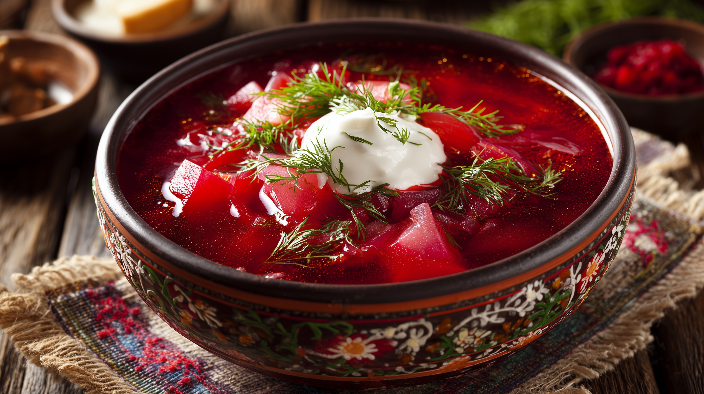 Die tiefrot schimmernde Borschtsch-Suppe in der traditionellen Keramikschale ist ein Blickfang auf dem rustikalen Holztisch. Garniert mit einer Krone aus cremigem Sauerrahm und frischen Dillzweigen entfaltet sich ein köstlicher Duft. Die Suppe ist ein klassisches Gericht der russischen Küche und besticht durch ihre intensive Färbung, die von den roten Beeten herrührt. Mit ihrer wärmenden Note ist sie ideal für die kältere Jahreszeit. Die Borschtsch-Suppe lässt sich hervorragend in Blogbeiträge, Social-Media-Posts oder Präsentationen einbinden und weckt Appetit auf traditionelle, saisonale Gerichte.