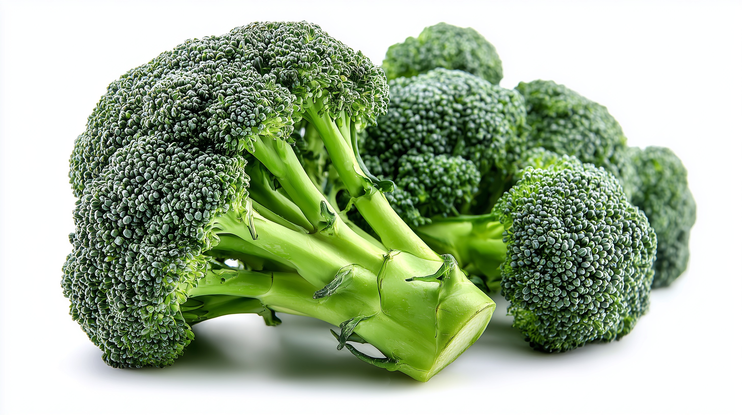Dieses Foto zeigt eine Nahaufnahme von saftigen, grünen Brokkoli-Röschen auf weißem Hintergrund. Die Brokkoli-Stücke sind in feiner Detailschärfe zu sehen, sodass die zarte Textur und Struktur der Blättchen deutlich erkennbar ist. Die kräftig grüne Farbe verleiht dem Gemüse eine frische, appetitliche Optik. Das Foto eignet sich hervorragend für den Einsatz in Rezepten, Ernährungs-Blogs, Social-Media-Beiträgen oder Präsentationen zum Thema gesunde Ernährung, Zubereitung von Speisen und Lebensmittelfotos. Mit seiner natürlichen, minimalistischen Ästhetik strahlt das Bild Frische und Vitalität aus und kann Betrachter zum Kochen und Genießen von Brokkoli inspirieren.