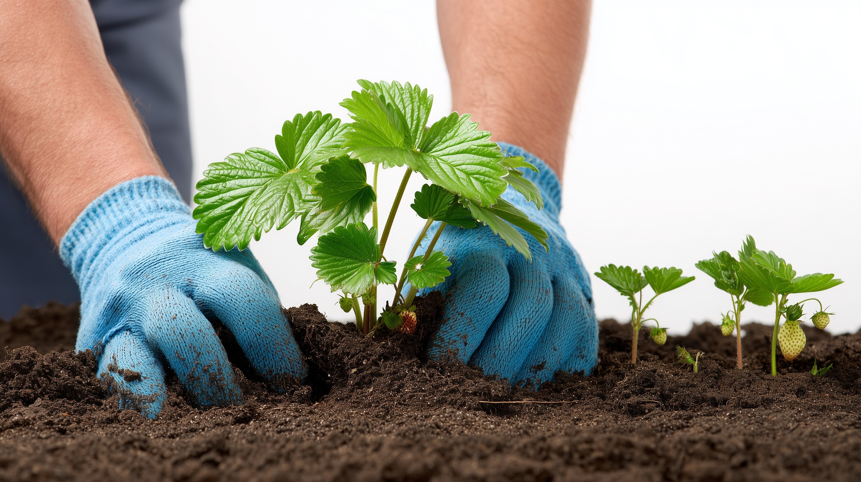 Das Foto zeigt Hände in blauen Gartenhandschuhen, die eine grüne Pflanze in den Boden einpflanzen. Die Pflanze hat mehrere große, gesunde Blätter und wirkt frisch und lebendig. Der dunkle, fruchtbare Boden ist um die Wurzeln herum sichtbar. Diese Szene könnte in einem Garten, auf einem Balkon oder auch in einem Gewächshaus aufgenommen worden sein.