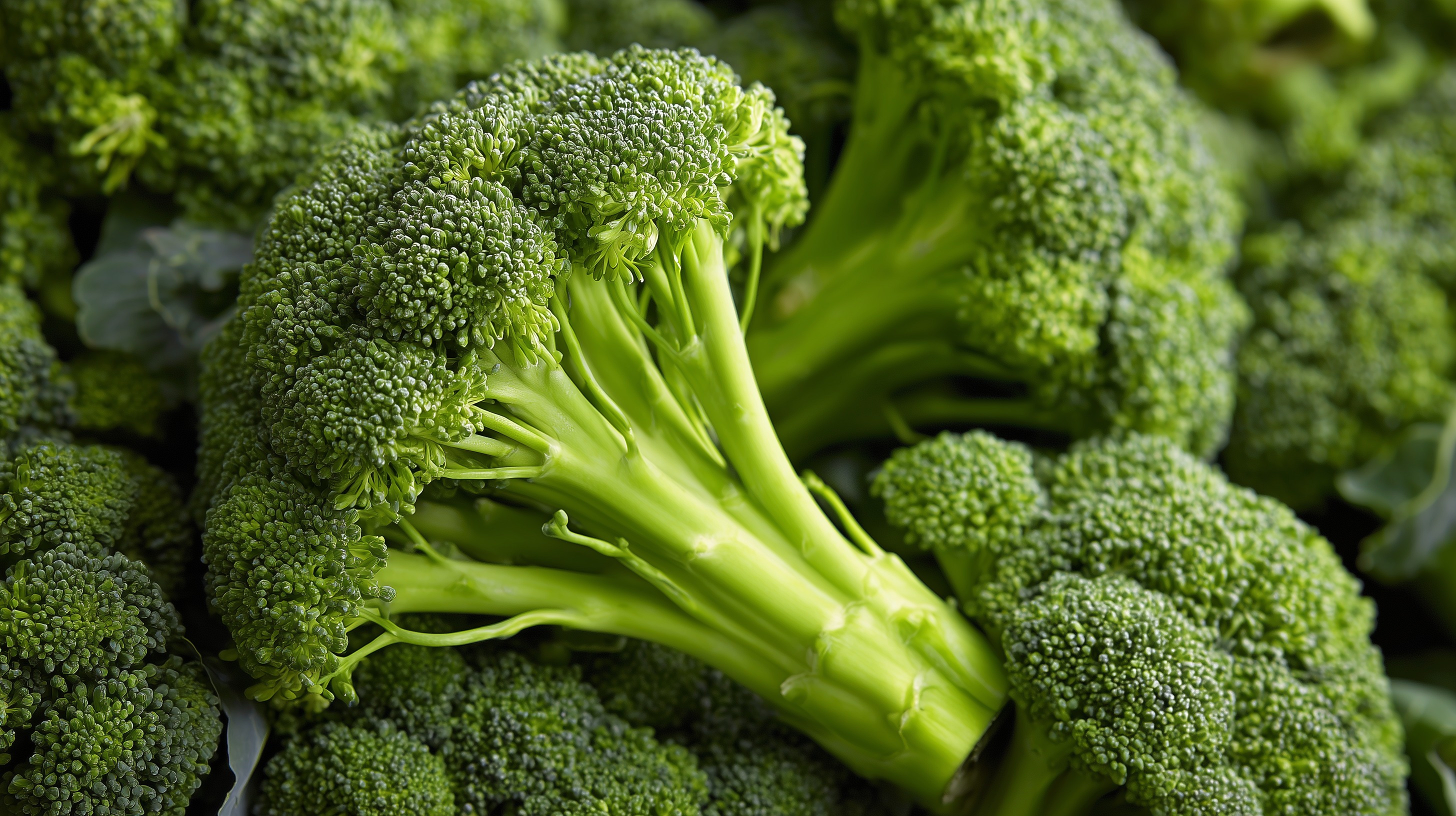 Das Foto zeigt einen Nahaufnahme-Blick auf saftigen, dunkelgrünen Brokkoli. Die dichten, rosetten-förmigen Röschen sind perfekt in Szene gesetzt, sodass ihre faszinierende Struktur und Textur deutlich hervortritt. Das Gemüse sticht förmlich aus dem leicht unscharfen, grünen Hintergrund hervor und erstrahlt in seiner natürlichen Frische und Lebendigkeit.