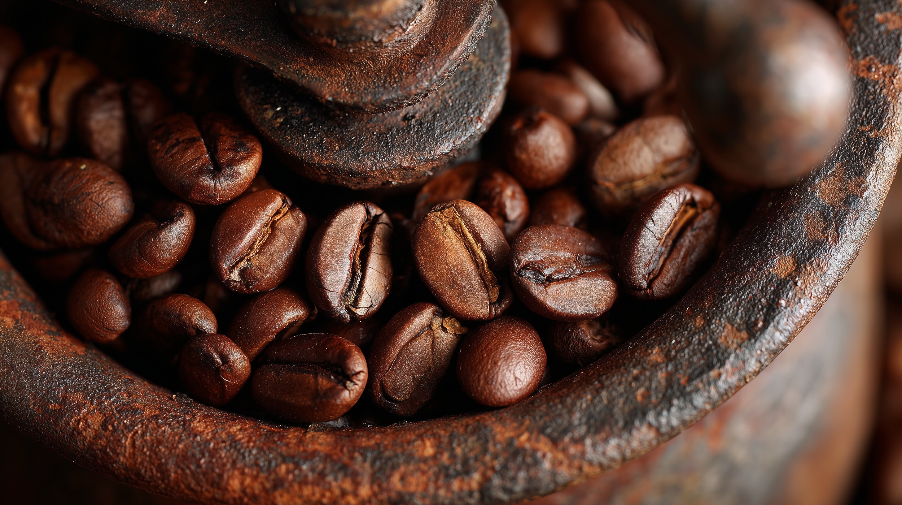Das Foto zeigt eine rustikale Kaffeeröstung in Nahaufnahme. Im Mittelpunkt befinden sich dunkel geröstete Kaffeebohnen, die sich in verschiedenen Farbtönen von Braun erstrecken. Die Oberfläche weist eine raue, unebene Struktur auf, was den rustikalen Charakter des Motivs unterstreicht. Die Kaffeebohnen sind scharf fokussiert, während der Hintergrund leicht unscharf erscheint, wodurch der Fokus ganz auf das Produkt gelenkt wird.