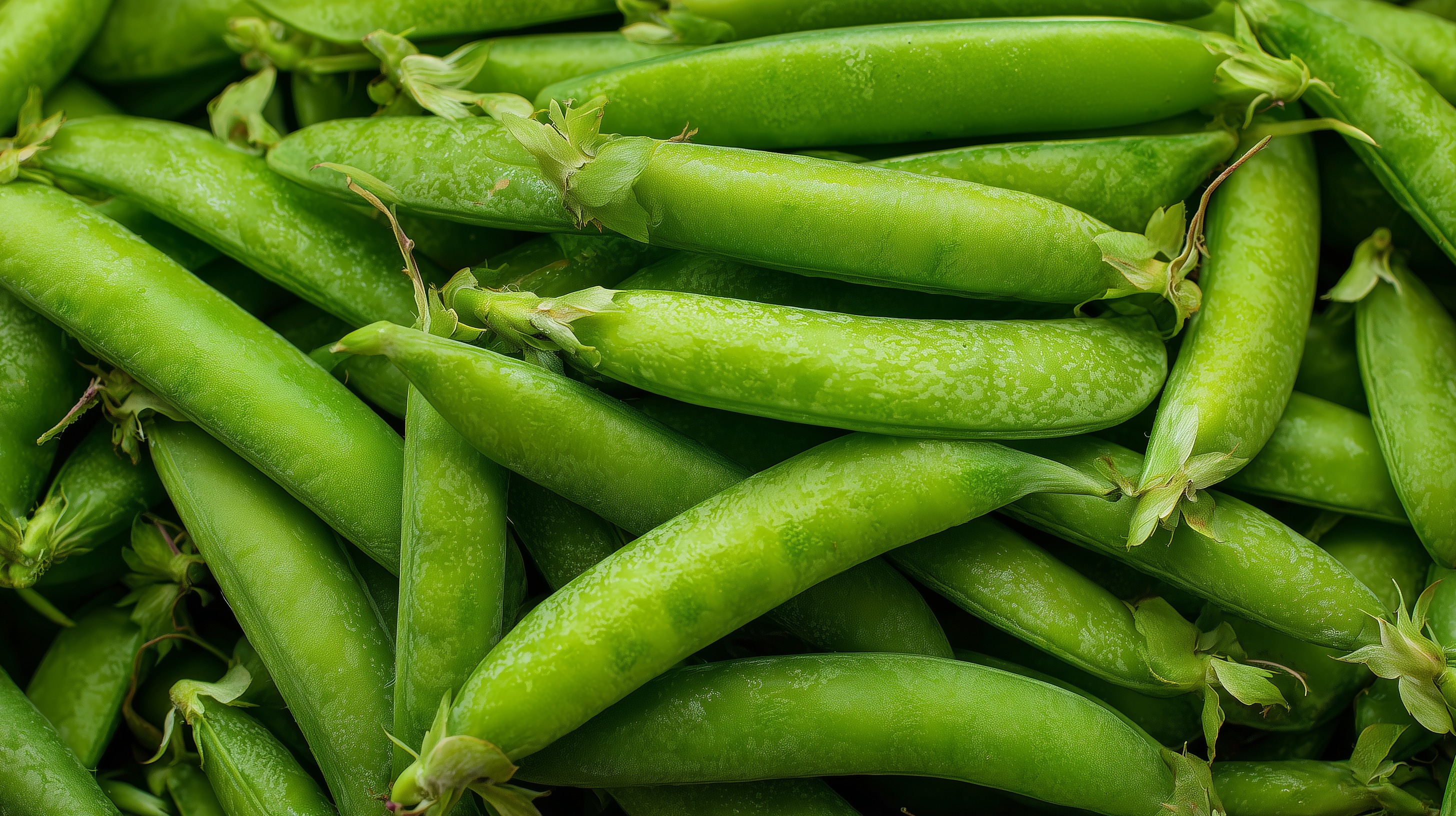 Dieses Foto zeigt eine Vielzahl von frischen, saftig grünen Erbsen in voller Blüte. Die knackigen, länglichen Hülsen heben sich kontrastreich von dem dunkleren Hintergrund ab und strahlen eine natürliche, lebendige Frische aus. Die Perspektive lässt den Betrachter die Erbsen ganz nah und detailliert wahrnehmen, sodass ihre feinen Strukturen und der natürliche Glanz deutlich erkennbar sind. Diese Aufnahme eignet sich hervorragend als eye-catching Hintergrundbild für Foodblogs, Rezeptsammlungen oder Präsentationen rund um gesunde, saisonale Ernährung. Darüber hinaus kann das Foto auch für Newsletter, Social-Media-Beiträge oder zur Gestaltung von Dekorationen verwendet werden, um natürliche Akzente zu setzen.