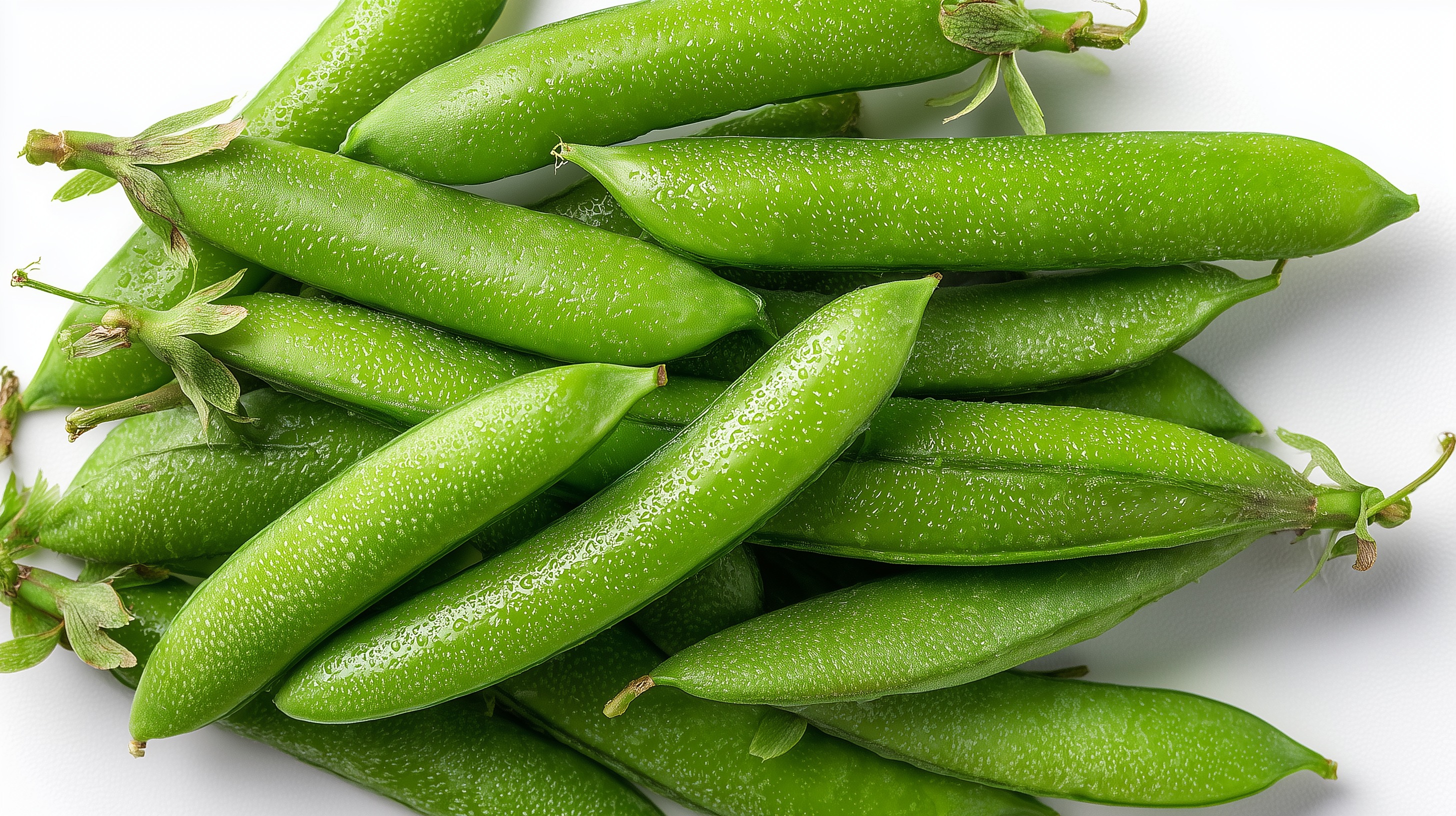 Das Foto zeigt eine Nahaufnahme von frischen, grünen Erbsenhülsen auf weißem Hintergrund. Die Erbsen sind perfekt gleichmäßig und knackig, mit einer satten, lebendigen Farbe. Die Anordnung der Hülsen ist sehr symmetrisch und ästhetisch, was einen klaren, aufgeräumten Eindruck vermittelt. Dieses Bild eignet sich hervorragend für Rezepte, Kochbücher, Lebensmittelblogs oder Werbekampagnen rund um gesunde Ernährung und Kochen. Der weiße Hintergrund bietet viel Freiraum für Text und Grafiken, sodass das Bild vielseitig einsetzbar ist - sei es in Präsentationen, Newslettern oder sozialen Medien. Mit seinen natürlichen Farben und der sauberen Optik strahlt das Foto Frische, Qualität und Natürlichkeit aus und kann Appetit auf leckere, vegetarische Gerichte wecken.