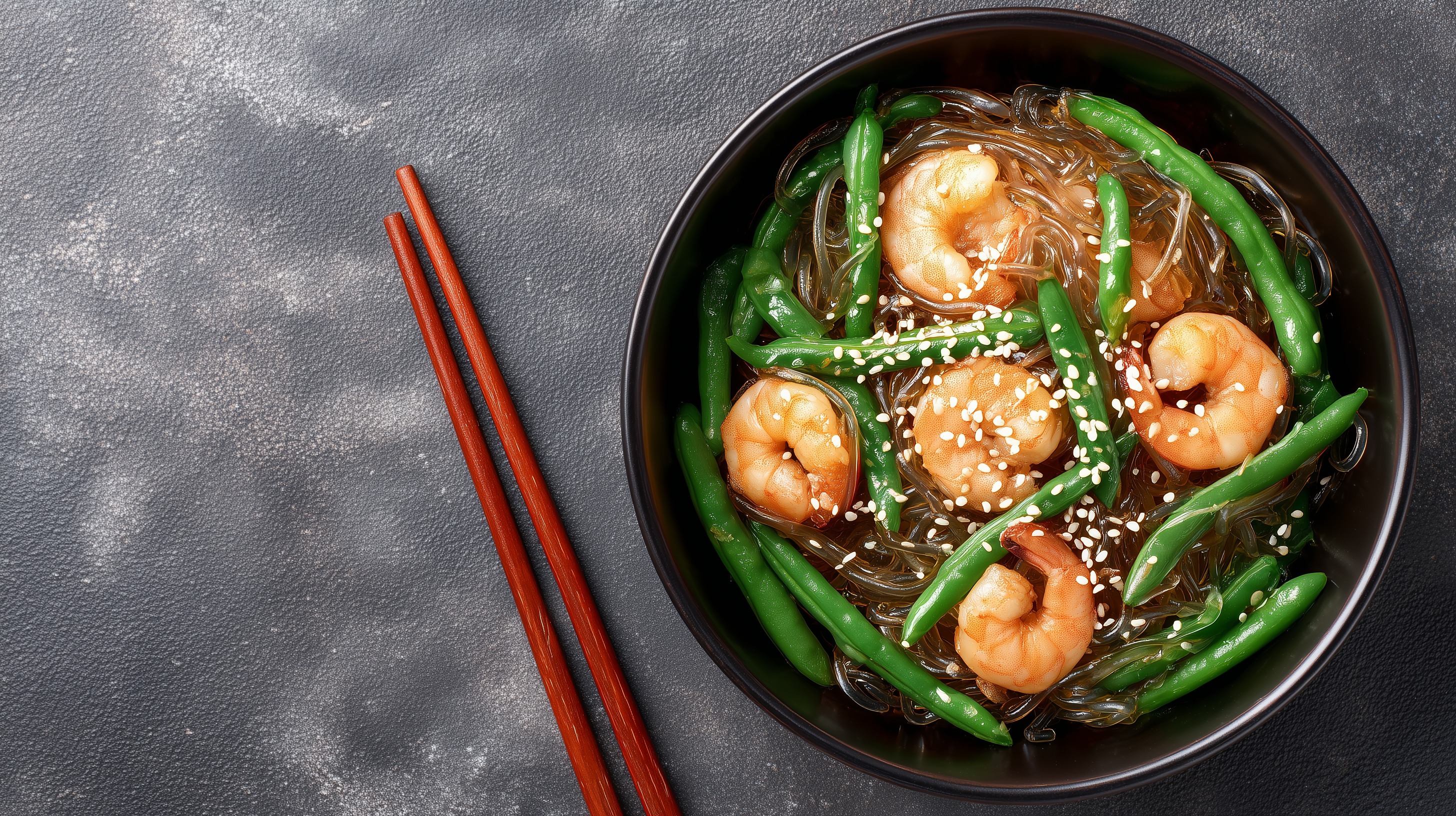 Auf diesem verlockenden Foto ist ein authentisches asiatisches Gericht zu sehen. Eine Schüssel gefüllt mit saftigen Garnelen, knackigen grünen Bohnen und feinen Glasnudeln, getaucht in einer aromatischen sojalasierten Soße und garniert mit dekorativen Sesamsamen. Das Bild strahlt eine warme, einladende Stimmung aus und lässt den Betrachter die intensiven Aromen und Texturen der Speise förmlich riechen und schmecken. Dieses Foto wäre ein echter Hingucker für Foodblogs, Kochbücher, Restaurantwebsites oder Social-Media-Kanäle, um den Appetit des Publikums anzuregen und die Sehnsucht nach asiatischer Küche zu wecken.