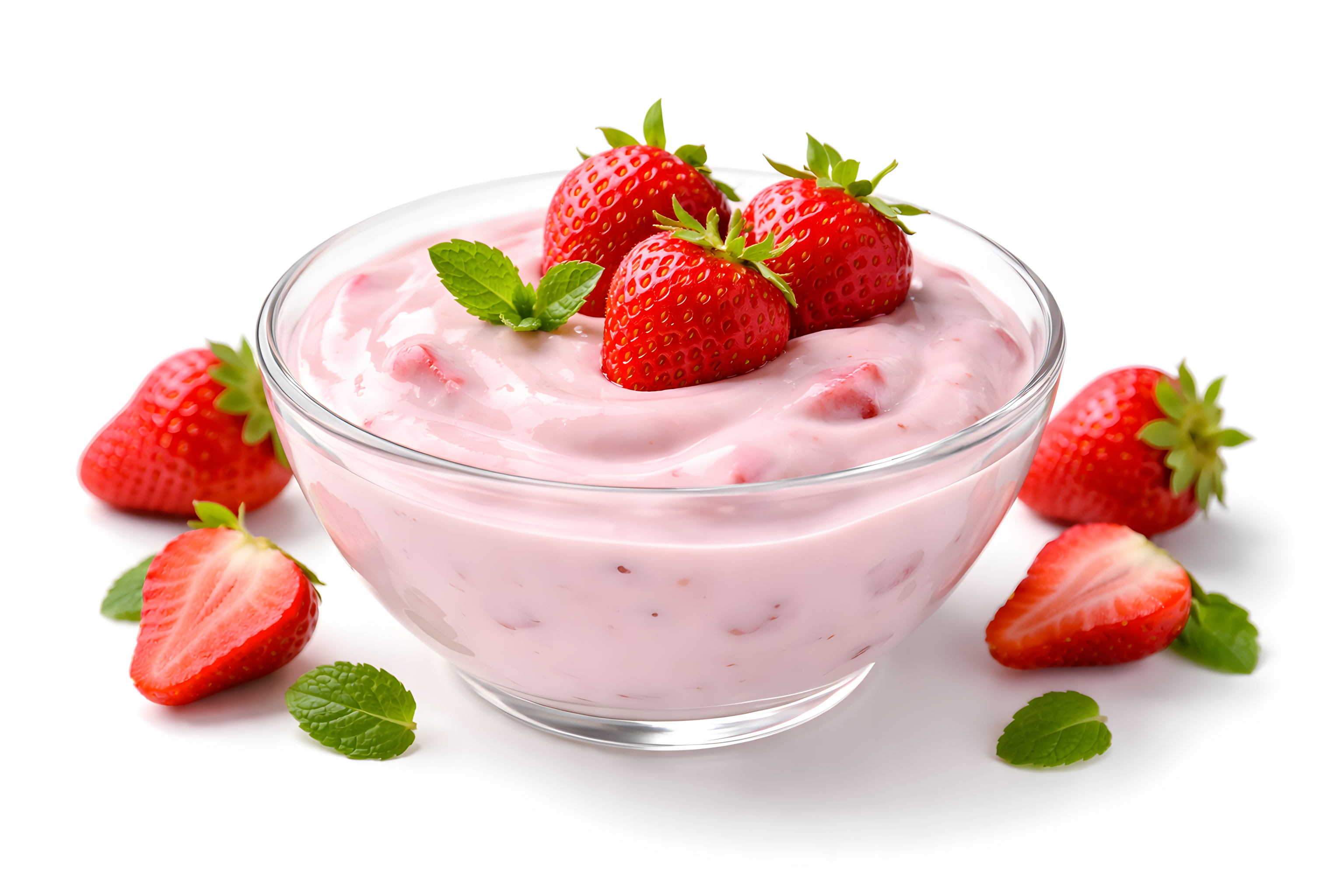 Das Foto zeigt eine köstliche Erdbeerschaumspezialität. In einem Glasgefäß ist ein rosa gefärbter Sahne- oder Quarkdessert zu sehen, dekoriert mit frischen, saftigen Erdbeeren. Die Erdbeeren verleihen dem Dessert nicht nur ein fruchtig-süßes Aroma, sondern sorgen auch für einen appetitlichen Farbkontrast. Umgeben sind die Komponenten von grünen Minzblättern, die das Arrangement harmonisch abrunden. Die Präsentation ist stilvoll und einladend, sodass das Foto ideal für Blogs, Social-Media-Kanäle oder Produktpräsentationen in der Gastronomie geeignet wäre. Insgesamt vermittelt das Bild einen Eindruck von Frische, Genuss und natürlicher Süße - ein Dessert, das Appetit auf mehr macht.