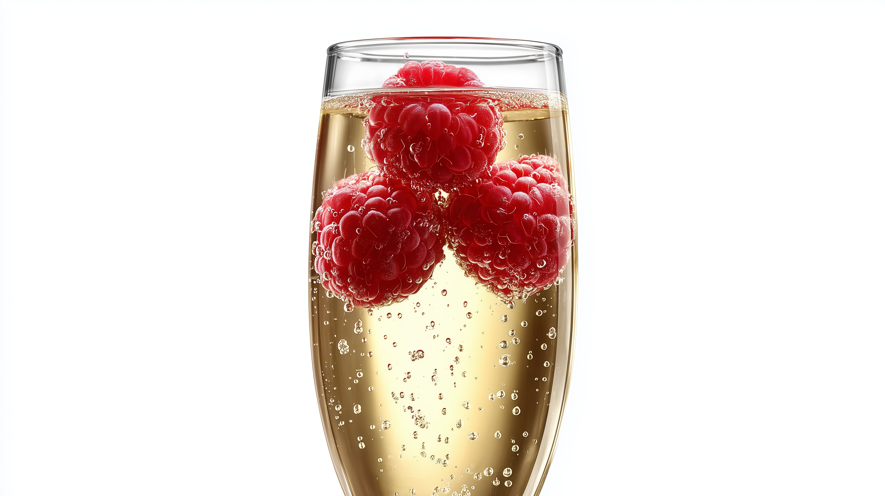 Dieses Foto zeigt einen prickelnden Champagner in einem eleganten Sektglas, garniert mit frisch gepflückten roten Himbeeren. Die Flüssigkeit ist goldgelb und glitzert durch die feinen Bläschen, die an der Oberfläche aufsteigen. Die dunkelroten Beeren formen einen schönen Kontrast zu dem hellen Getränk und verleihen dem Bild eine besonders appetitliche Anmutung. Das Foto ist in einer natürlichen Lichtsituation aufgenommen, was dem Gesamteindruck eine stimmungsvolle, fast feierliche Atmosphäre verleiht. Solch ein Motiv eignet sich hervorragend für Präsentationen von Luxusmarken, in Blogbeiträgen zu besonderen Anlässen oder in Social-Media-Posts, um Genuss und Lebensfreude zu vermitteln.