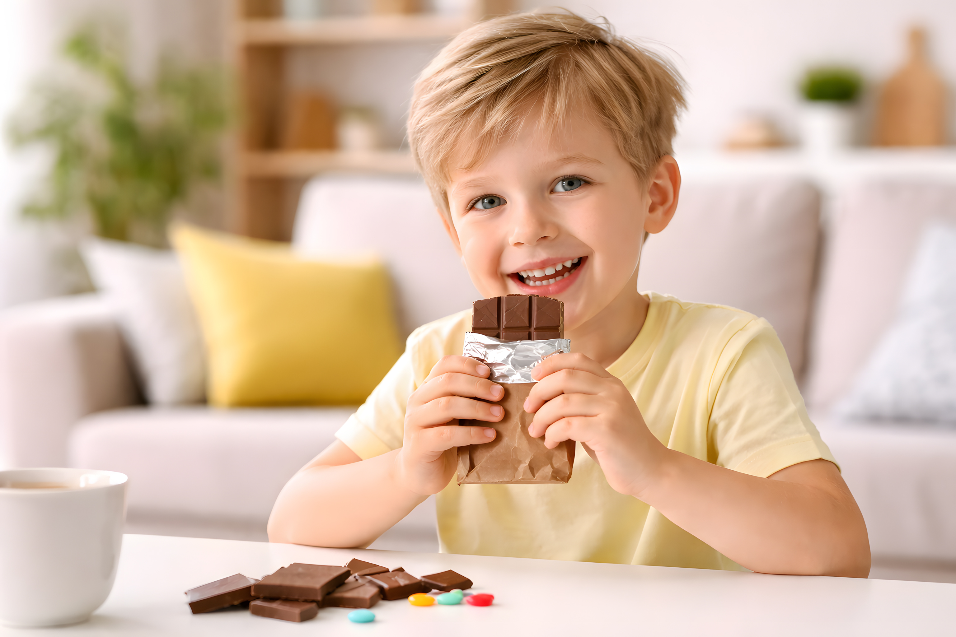 Das Foto zeigt einen fröhlichen, lächelnden Jungen, der sichtlich Freude an einer Tafel Schokolade hat. Die Aufnahme mit natürlichem Tageslicht und einer warmen, gemütlichen Atmosphäre vermittelt ein Gefühl von Zufriedenheit und Genuss. Der Junge sitzt an einem Holztisch und hat die Schokolade in seinen Händen, was auf eine Pause oder eine ungezwungene Situation hindeutet. Das Bild eignet sich hervorragend als Illustration für Themen rund um Ernährung, Lifestyle, Freizeitgestaltung oder das Wohnen. Es kann in Blogbeiträgen, Social-Media-Kanälen, Präsentationen oder Newslettern eingesetzt werden, um Emotionen und Stimmungen zu transportieren.