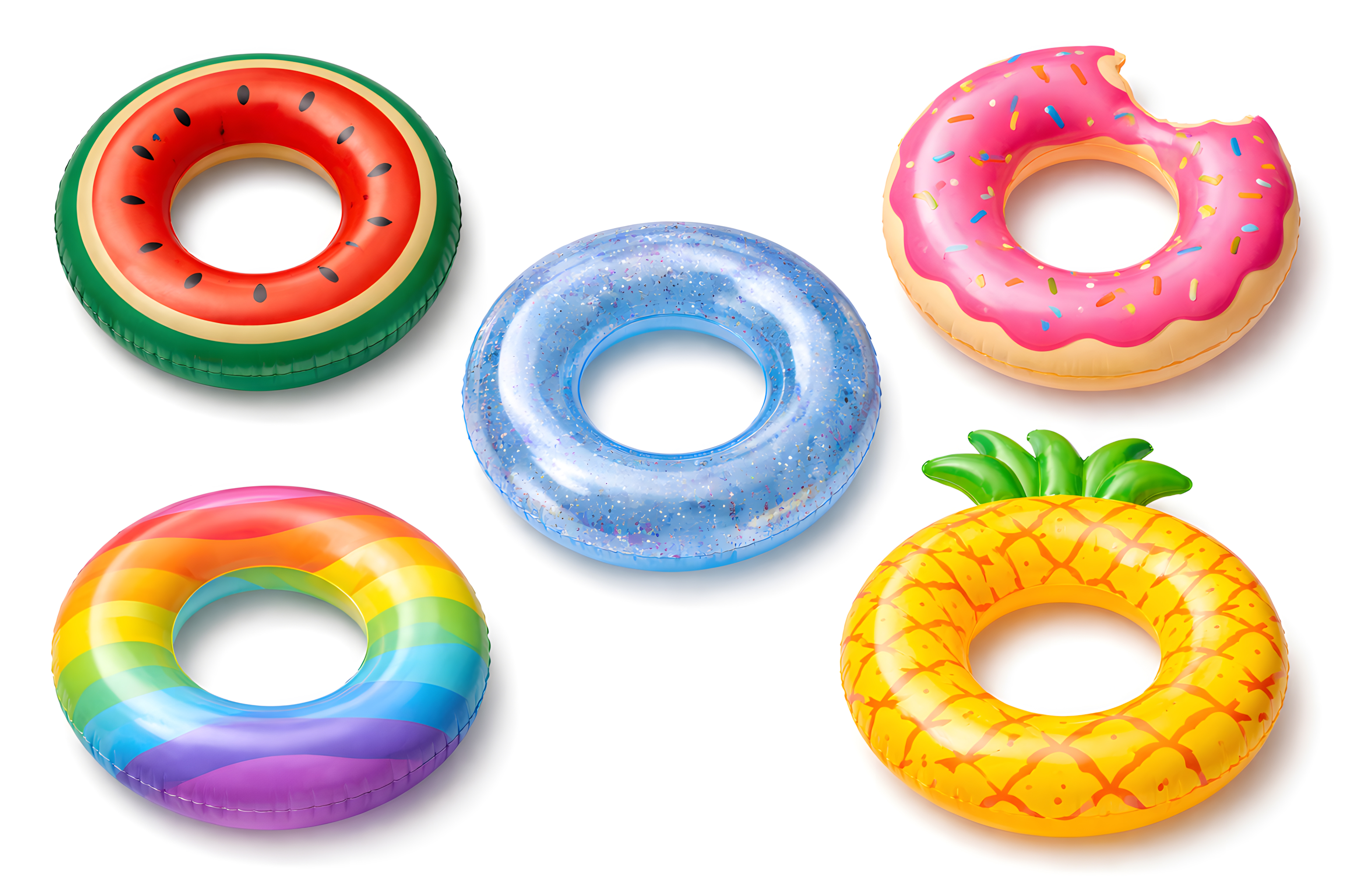 Dieses Foto zeigt eine bunte Auswahl an aufblasbaren Schwimmringen in sommerlichen Formen wie Wassermelone, Ananas und Regenbogen. Die kunstvoll gestalteten Reifen aus Gummi oder Plastik mit Luftventilen laden zum Schwimmen, Plantschen und Entspannen im Pool oder am Strand ein. Die farbenfrohen Designs in knalligen Tönen sorgen für eine sommerliche, fröhliche Stimmung und können als dekorative Elemente in Fotografie, Webdesign oder Werbung eingesetzt werden. Die Schwimmhilfen eignen sich hervorragend als Werbegeschenke, Verkaufsartikel oder für den privaten Gebrauch, um den Urlaubsgenuss zu steigern.