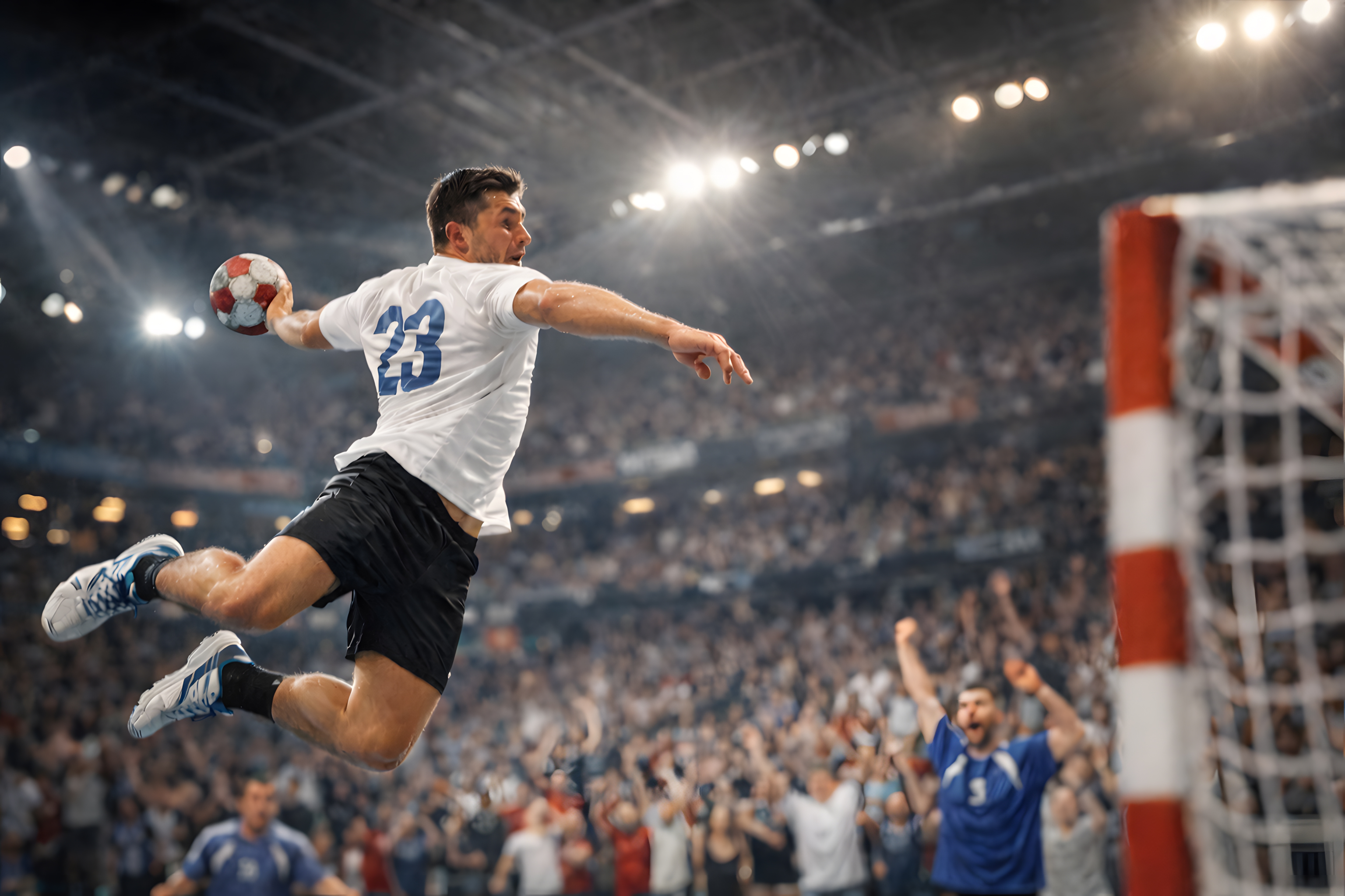 Das Foto zeigt einen Handballtorhüter in dynamischer Bewegung bei einer Sportveranstaltung. Der Athlet ist in der Luft zu sehen, wie er einen Ball mit geballter Kraft in Richtung des Tores wirft. Dabei ist der Körper angespannt und die Mimik des Sportlers konzentriert. Im Hintergrund sind zahlreiche Fans zu erkennen, die die Partie lautstark verfolgen. Die Beleuchtung im Stadion sorgt für eine dramatische Stimmung und hebt den Moment der Anspannung und Leistung des Torwarts hervor. Dieses dynamische Foto eignet sich hervorragend für den Einsatz in Sportberichten, Präsentationen zum Thema Leistungssport oder Social-Media-Kanälen rund um Handball und andere Mannschaftssportarten.