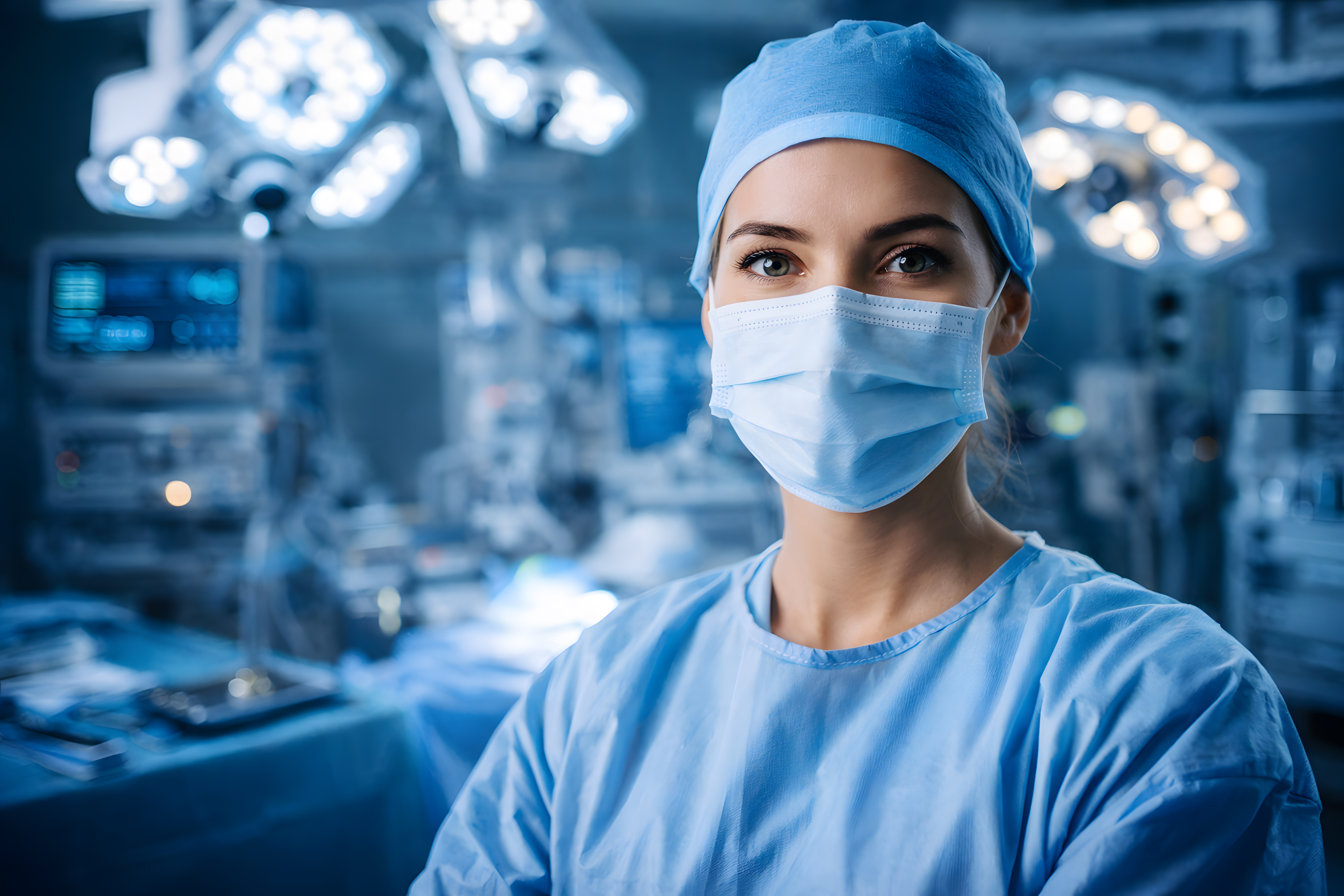 Das Foto zeigt eine Ärztin in voller Schutzmontur, die sich für eine Operation im Operationssaal vorbereitet. In der sterilen, von blauen Farbtönen dominierten Umgebung ist sie konzentriert und fokussiert auf die bevorstehende medizinische Behandlung. Die Verwendung der Schutzkleidung, bestehend aus OP-Haube, -Maske und -Kittel, vermittelt den professionellen und sicheren Ansatz in der hochspezialisierten Welt der Medizin. Dieses Bild eignet sich hervorragend für die Verwendung in Blogbeiträgen, Social-Media-Posts oder Präsentationen rund um Themen wie Gesundheitswesen, Chirurgie, Intensivmedizin oder hochwertige medizinische Versorgung. Es unterstreicht den hohen Stellenwert von Sicherheit und Kompetenz in der Medizin und kann Vertrauen in die Fähigkeiten des ärztlichen Personals vermitteln.