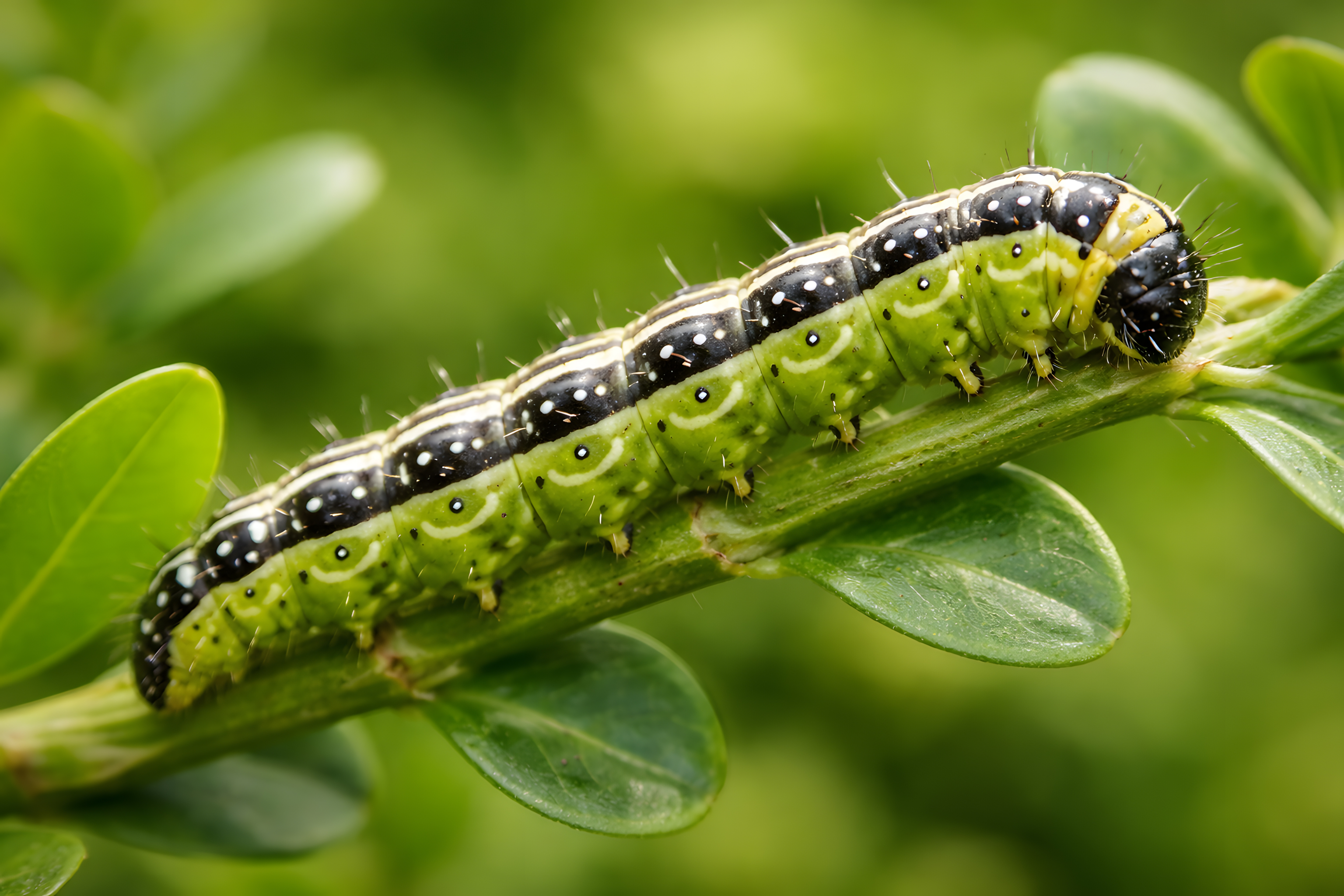 Das Foto zeigt eine detaillierte Nahaufnahme einer faszinierenden, gestreiften Raupe, die auf grünen, glänzenden Blättern sitzt. Die leuchtenden Farben und das scharfe, klare Bild lassen die kleine Kreatur fast dreidimensional erscheinen. Die Textur und das Muster des Insekts treten deutlich hervor und laden zum genauen Betrachten ein. Solch eine Nahaufnahme eines Naturdetails eignet sich hervorragend für den Einsatz in Blogs, Social-Media-Beiträgen, Newslettern oder Präsentationen, die ein Gefühl für die Wunder der Natur vermitteln möchten. Das Foto könnte auch in einem Beitrag über Ökologie, Tierwelt oder Gartenbau verwendet werden.