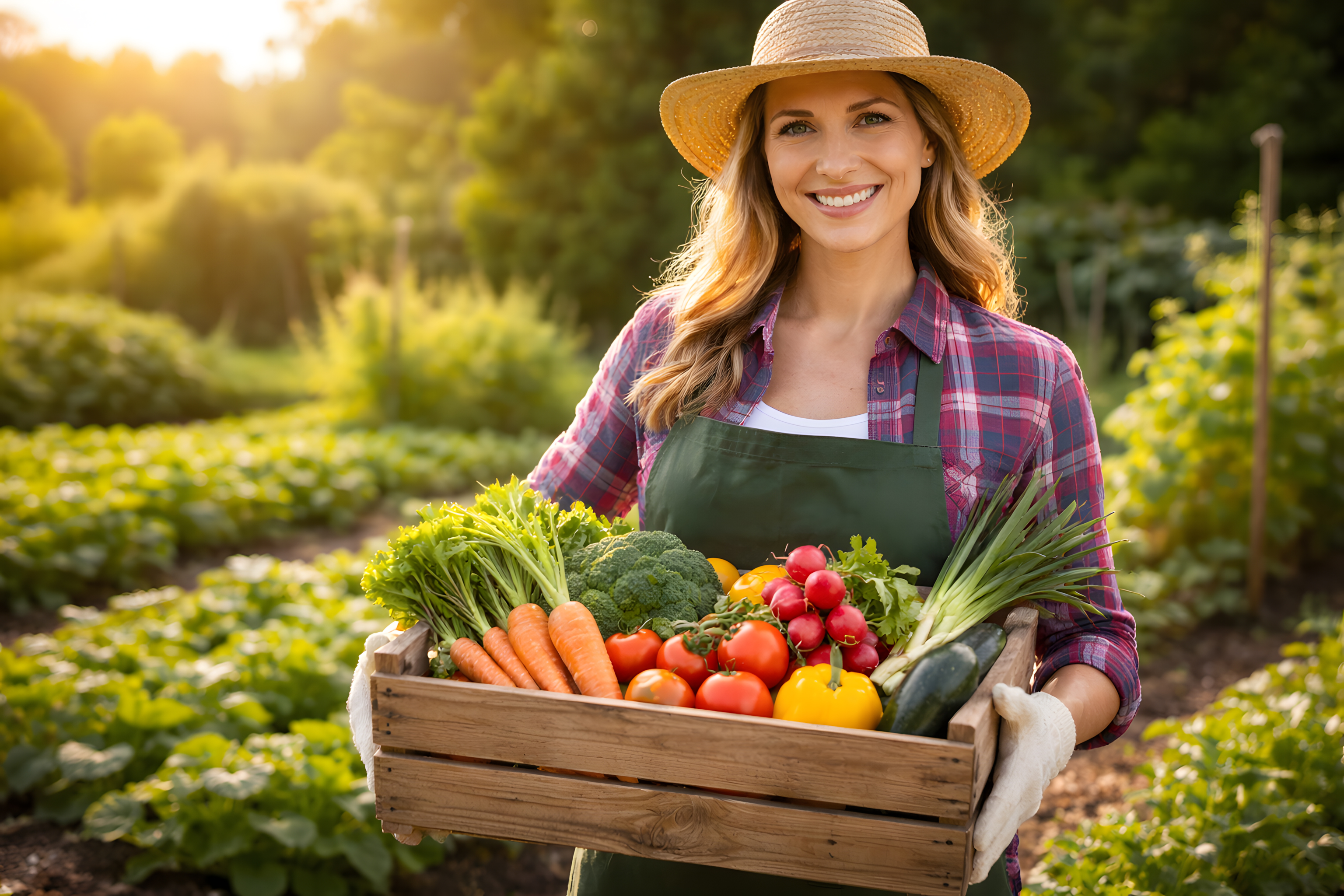 Das Foto zeigt eine lächelnde Frau, die eine Kiste voller frischer Gemüsesorten in ihren Händen hält. Sie befindet sich in einem üppigen Garten, umgeben von Bäumen und Sträuchern. Die Sonne scheint auf ihr und lässt ihre Haare und das Grün der Umgebung strahlen. Die Frau trägt ein kariiertes Hemd und einen Strohhut, was ihre ländliche Umgebung unterstreicht. Das Bild strahlt Lebenslust, Entspannung und Zufriedenheit aus und könnte gut in einem Blogbeitrag über gesunde Ernährung, nachhaltige Landwirtschaft oder ein entspanntes Landleben eingesetzt werden. Es eignet sich auch für Social-Media-Kanäle, Newsletter oder Präsentationen rund um Themen wie Selbstversorgung, biologischen Anbau und einen gesunden Lebensstil.