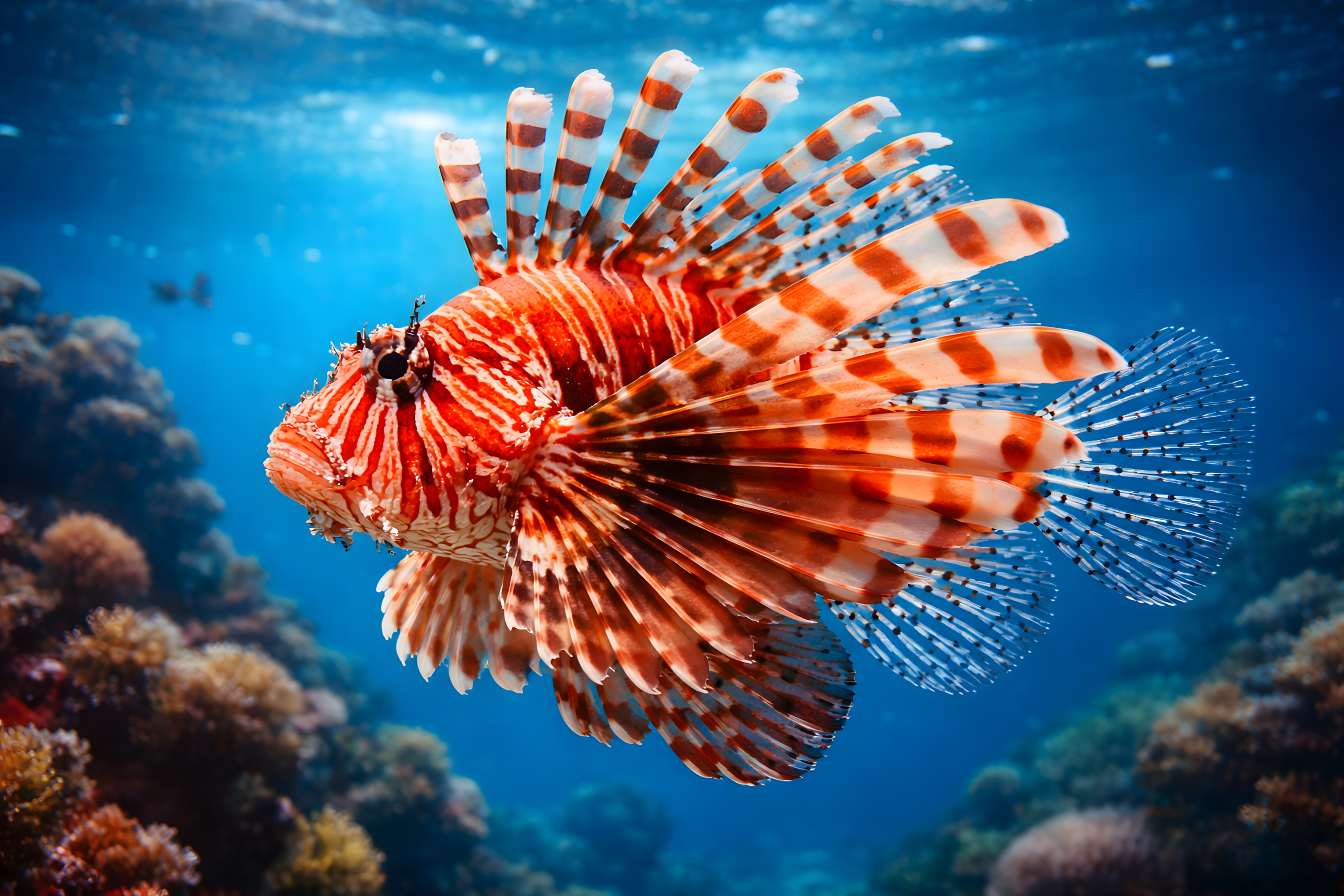 Das Foto zeigt einen beeindruckenden Feuerfisch, auch bekannt als Rotfeuerfisch oder Pterois, in seiner natürlichen Umgebung unter Wasser. Mit seinen auffallend roten und weiß-gestreiften Flossen und dem stacheligen Körper ist dieser Raubfisch ein wahrer Blickfang. Die scharfen Stacheln dienen ihm als Verteidigung gegen Fressfeinde. Der Feuerfisch lebt in tropischen Korallenriffen und Raubfischjagd ist seine Hauptbeschäftigung. Dieses Foto in leuchtenden Unterwasserfarben eignet sich hervorragend als Eyecatcher für Blogs, Social Media-Beiträge, Präsentationen oder Newsletter zum Thema Meeresbiologie, Tauchen oder exotische Tierwelt.