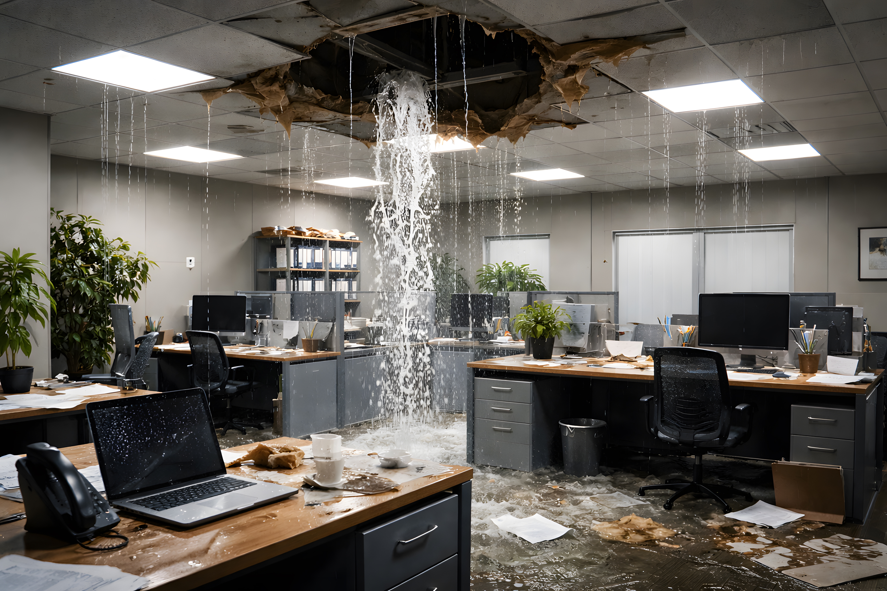 Das Foto zeigt ein modernes Bürodesign, das von einem Wasserschaden verwüstet wurde. Mitten im Raum befindet sich eine Öffnung in der Decke, aus der Wasser in Strömen heraussprudelt und den gesamten Raum unter Wasser setzt. Büromöbel, Computer und Dekorationselemente sind von den Wassermassen überschwemmt und liegen teilweise durcheinander.