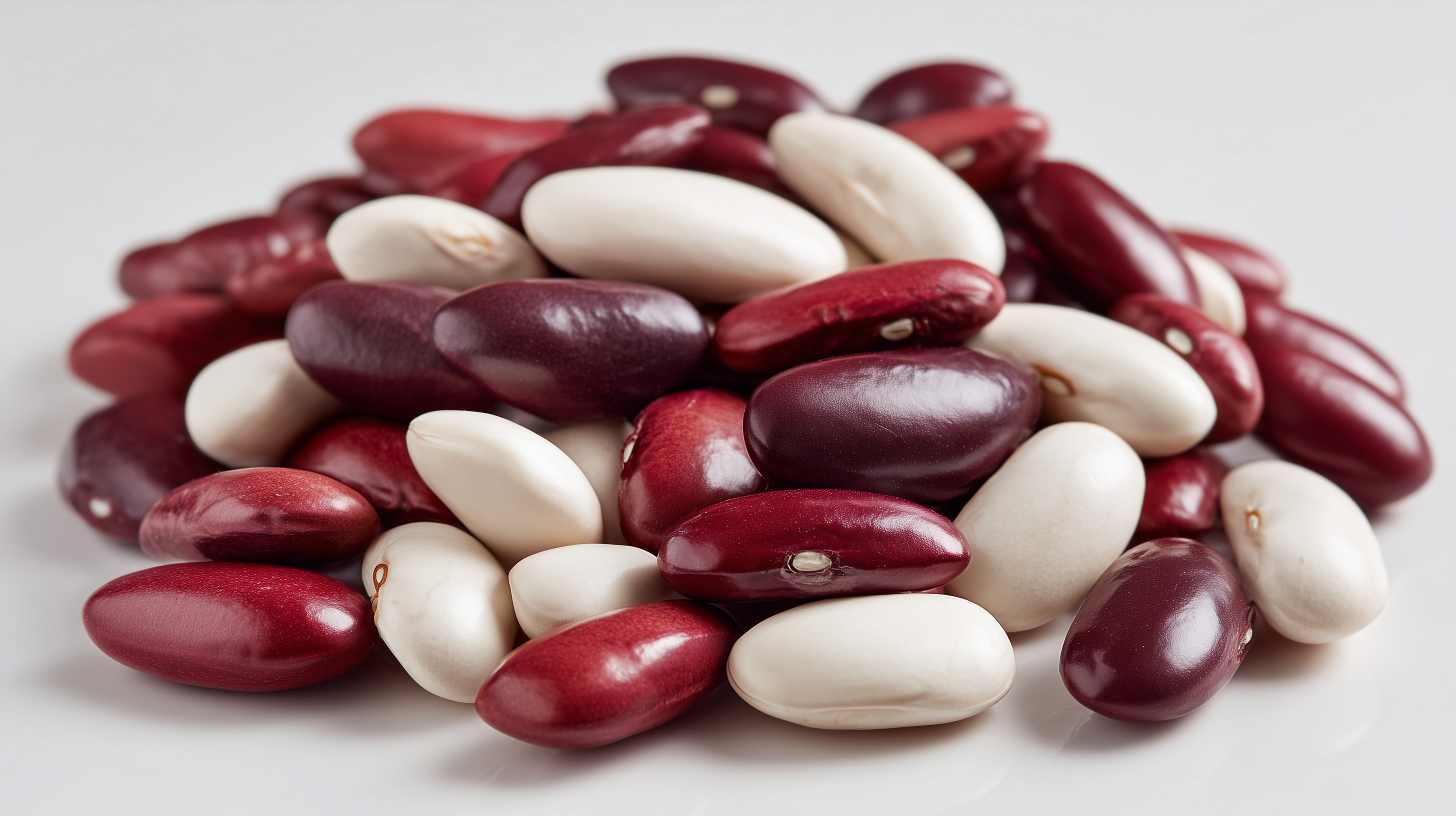 Auf diesem Foto sehen wir eine bunte Mischung aus roten und weißen Bohnen. Die kräftig roten und die cremeweißen Hülsenfrüchte bilden einen attraktiven Kontrast und eine appetitliche Komposition. Die Bohnen sind in einer leicht unregelmäßigen, natürlichen Anordnung auf einer hellen Oberfläche platziert, was eine ansprechende Perspektive und Tiefe in das Bild bringt. Dieses Stockfoto eignet sich hervorragend für Rezepte, Kochbücher, Food-Blogs oder Social-Media-Beiträge rund um eine ausgewogene, vegetarische Ernährung. Die Bohnen sind reich an Ballaststoffen, Proteinen und weiteren wertvollen Nährstoffen und machen damit das Foto zu einem nützlichen Werkzeug für gesundheitsbewusste Inhalte.