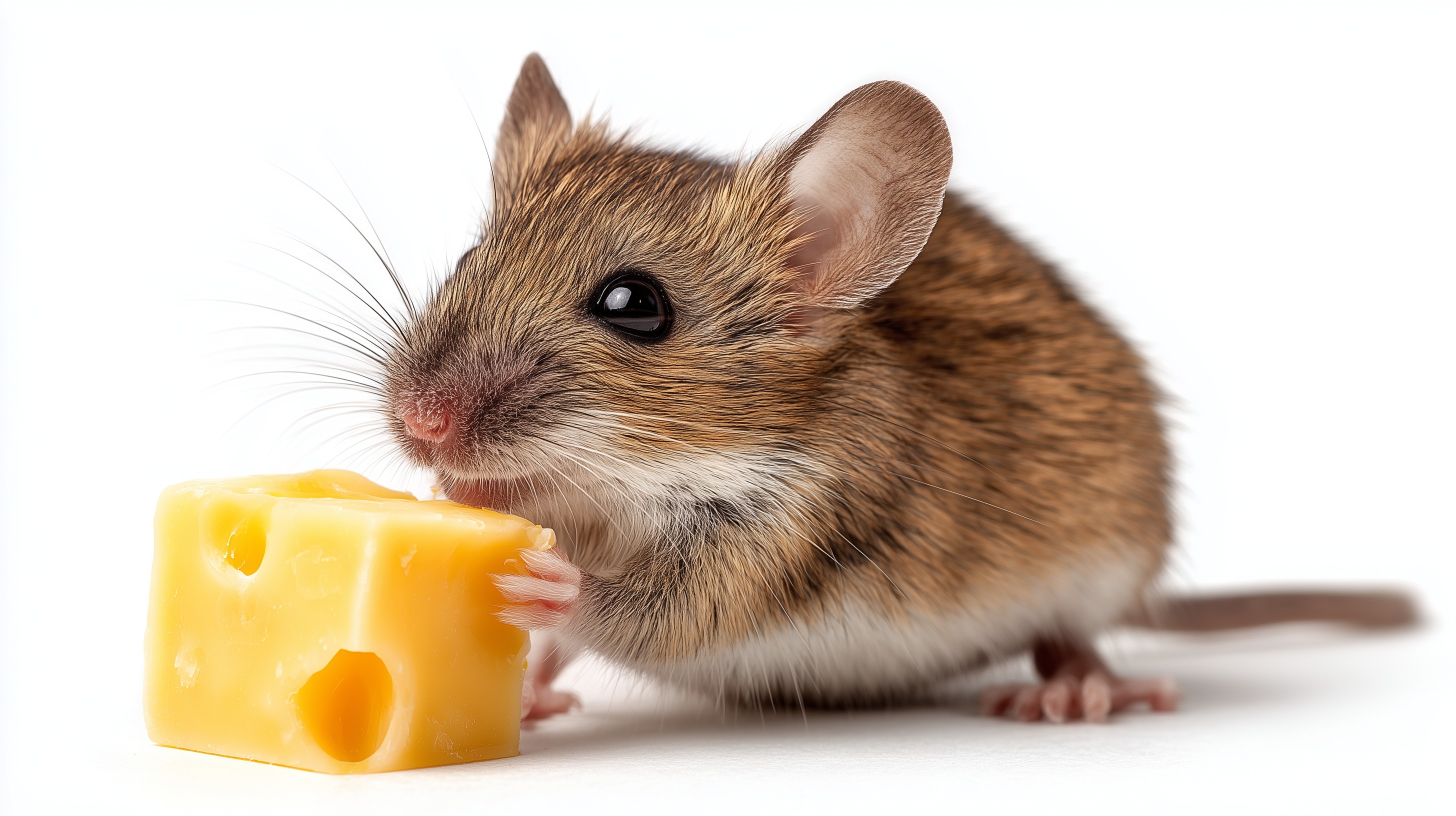Auf dem Foto ist eine süß anzusehende Feldmaus zu sehen, die ein Stück Käse in ihren Vorderpfoten hält. Die Maus hat einen pelzigen braunen Körper mit großen schwarzen Augen und einer feinen Nase. Ihr Gesichtsausdruck ist sehr niedlich und scheint die Freude über den leckeren Käseschnack widerzuspiegeln.