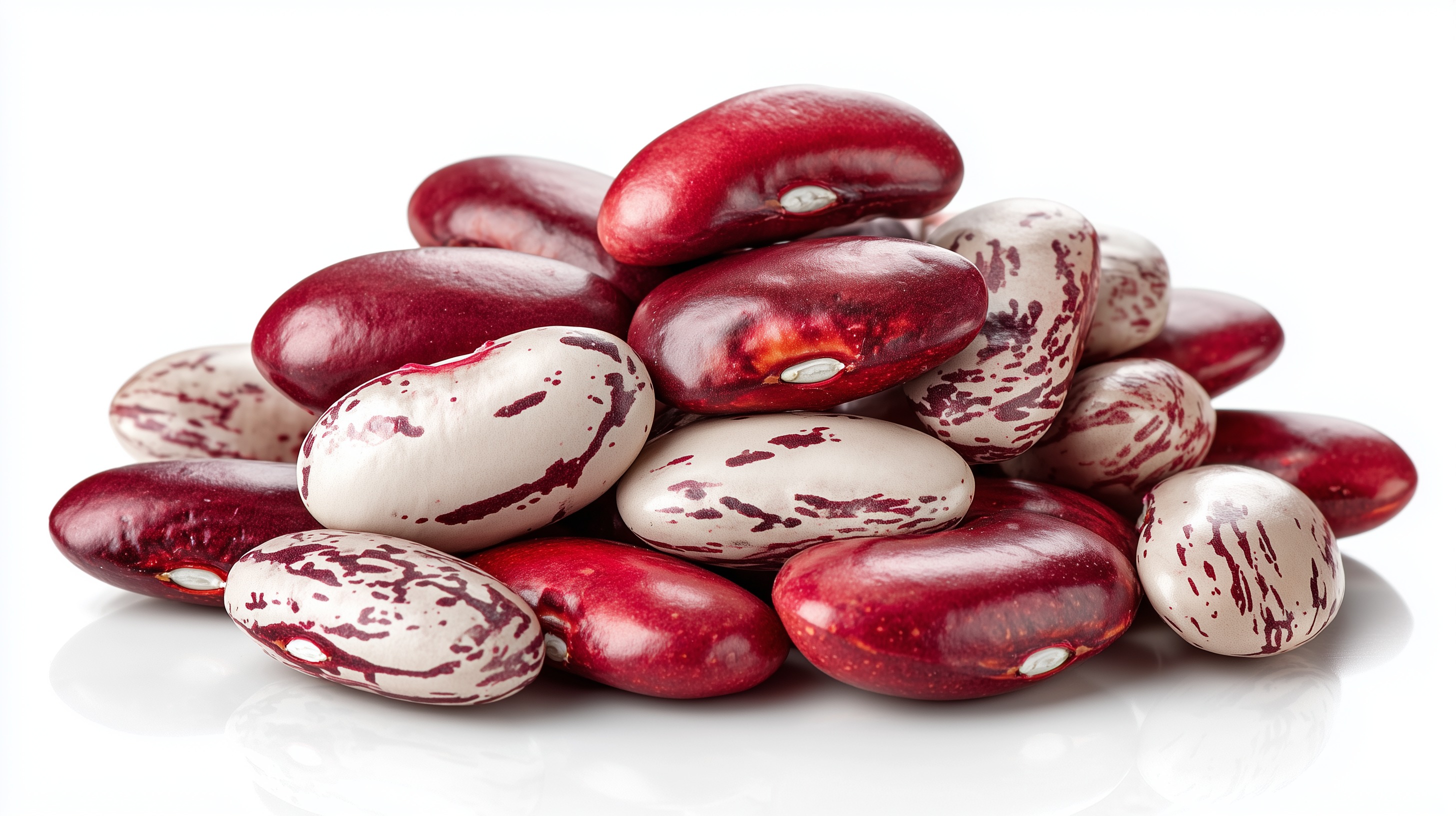 Das Foto zeigt eine Nahaufnahme von roten, gefleckten Bohnen, die auf einem weißen Hintergrund angeordnet sind. Die Bohnen haben eine glänzende, leicht feuchte Oberfläche und präsentieren sich in einer appetitlichen Komposition. Die kontrastreichen Farben Rot und Weiß sowie die detailreiche Textur der Bohnen verleihen dem Bild eine natürliche, frische Anmutung. Diese Hülsenfrüchte sind nicht nur gesund, sondern auch vielseitig einsetzbar - sei es in Salaten, Suppen, Eintöpfen oder vegetarischen Gerichten. Das Foto eignet sich hervorragend für Verwendungen in Kochblogs, Ernährungsratgebern oder Social-Media-Beiträgen zum Thema gesunde Ernährung.