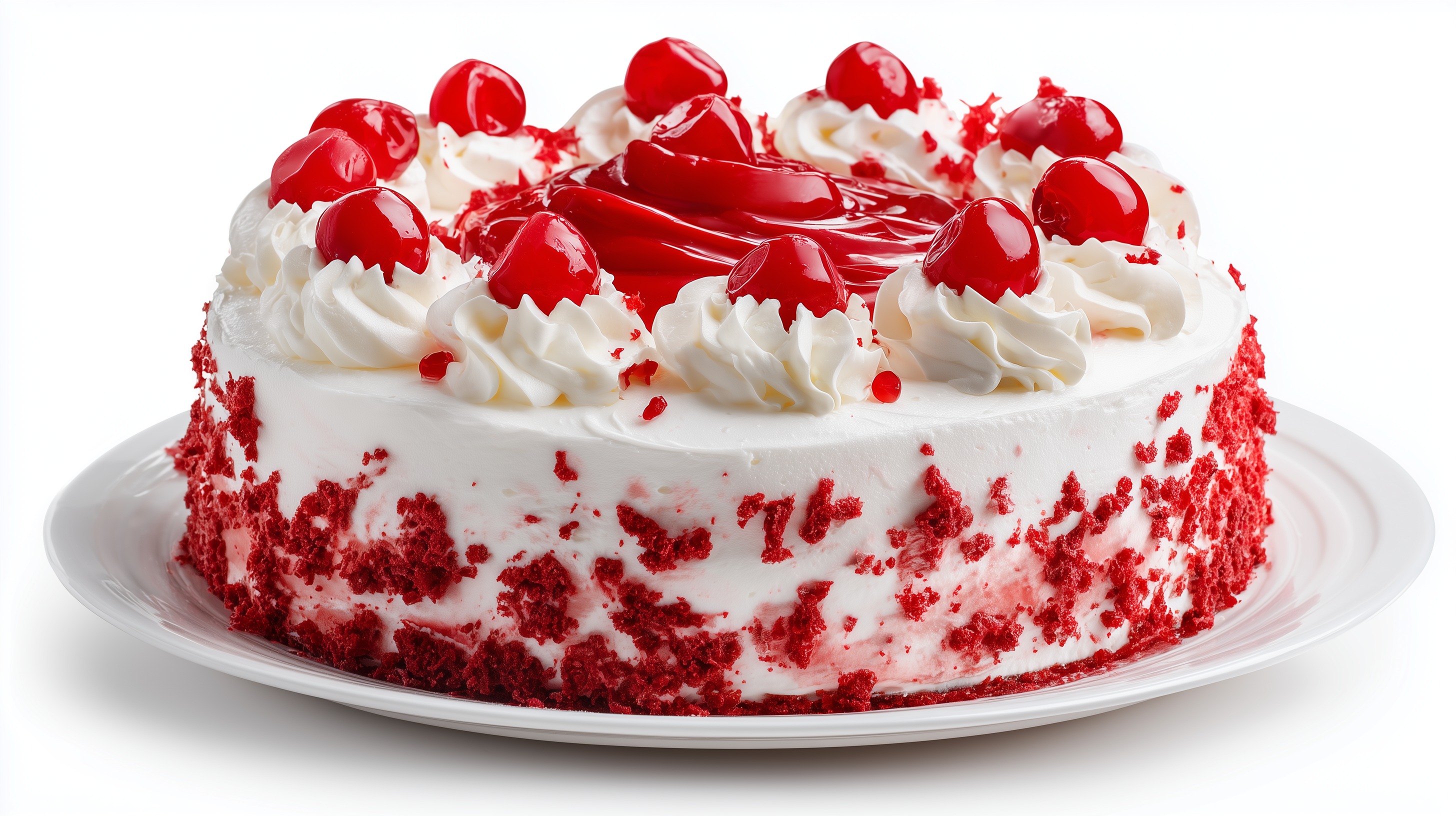 Dieser verlockende Rotvelvet-Kuchen ist ein wahrer Blickfang. Die leuchtend rote Oberfläche ist mit einer cremigen, weißen Sahnehaube überzogen und mit glänzenden roten Kirschen dekoriert. Der Kontrast zwischen dem intensiven Rot des Kuchenkörpers und der hellen Sahne wirkt äußerst stilvoll und elegant. Durch die sorgfältige Präsentation auf einem schlichten weißen Teller kommt die Pracht des Kuchens optimal zur Geltung. Ob als Highlight auf einer Hochzeitstorte, als Geburtstagskuchen oder für ein gemütliches Kaffeekränzchen - dieser Rotvelvet-Kuchen ist ein wahrer Genuss für Auge und Gaumen. Mit seiner festlichen Optik und dem leckeren Geschmack bringt er Freude in jeden Anlass.