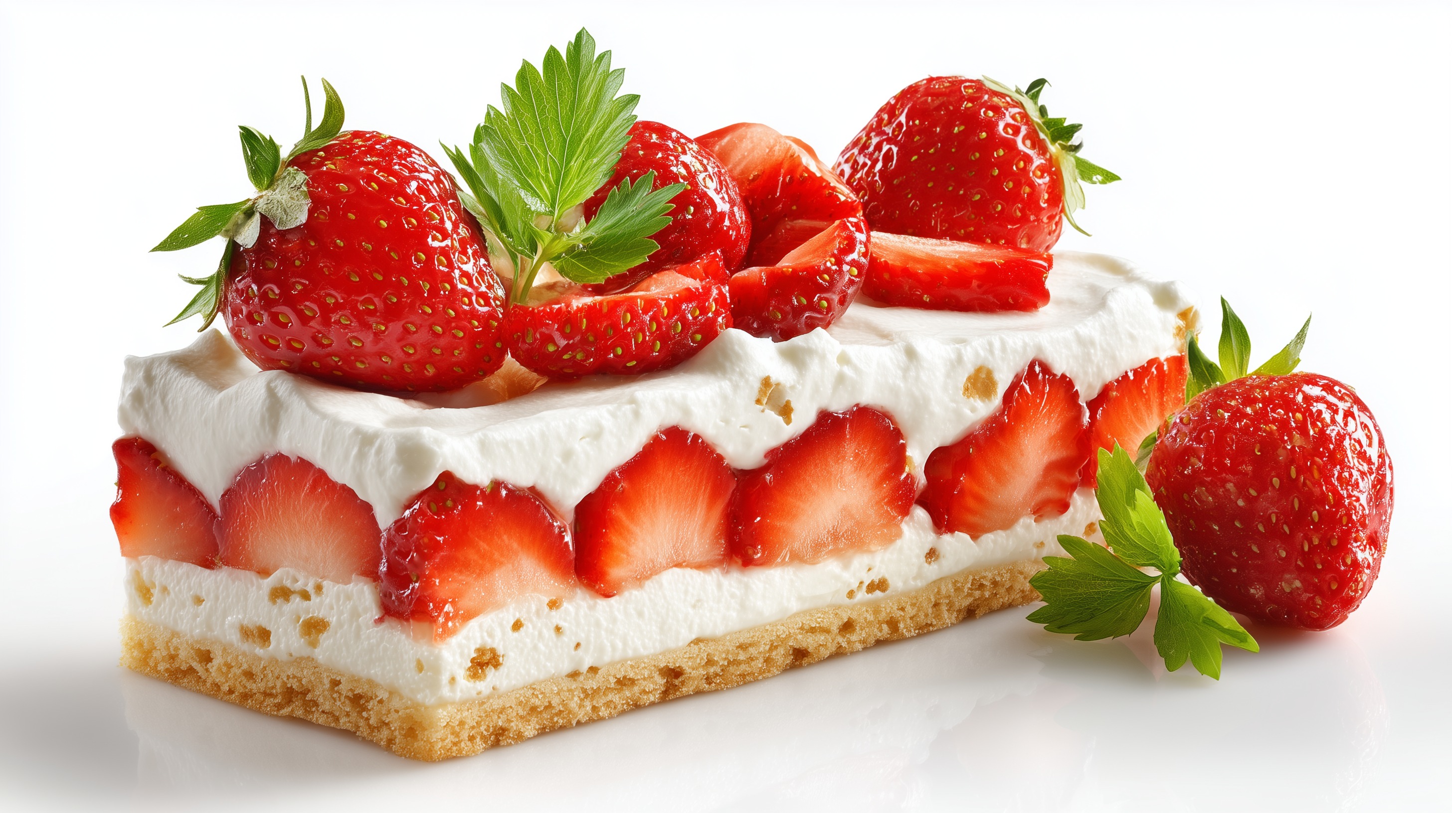 Das Foto zeigt einen verlockenden Erdbeerkuchen mit einem üppigen Sahnetopping. Die reifen, saftigen Erdbeeren sind liebevoll auf dem Gebäck angeordnet und verleihen dem Dessert einen kräftigen Farbkontrast. Die Nahaufnahme betont die Textur und Frische der Zutaten, die zu einem appetitlichen, natürlichen Gesamteindruck führen. Dieser Kuchen wäre perfekt als Dessert für Kaffee und Kuchen, für eine Gartenparty oder als Beilage zu einem Sommerbuffet. Die leuchtende Farbgebung und die detailreiche Darstellung machen dieses Bild ideal für die Verwendung in Rezeptbüchern, Lebensmittelblogs oder zur Dekoration von Social-Media-Beiträgen.