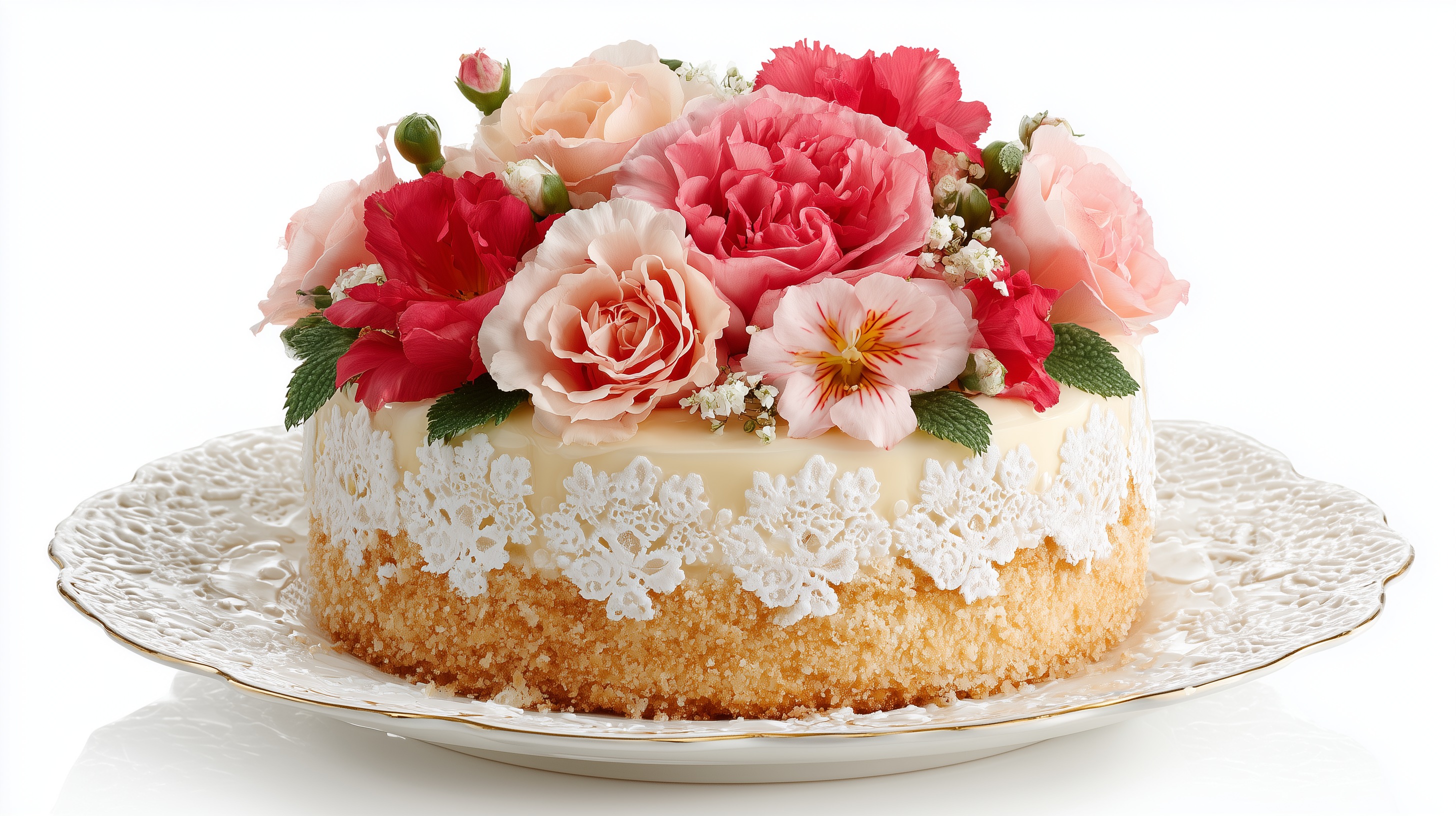 Diese prachtvolle Geburtstagstorte ist ein wahrer Augenschmaus. Sie ist mit einem Hauch von Spitze verziert und liebevoll mit einer bunten Blütenpracht geschmückt. Die Kombination von zarten Rosen in Rosé, kräftigen Nelken in Rot sowie kleinen Stiefmütterchen in Pink und Gelb verleiht der Torte einen festlichen und zugleich romantischen Charakter. Die Torte scheint auf einem elegant verzierten Servierständer zu stehen, der das Arrangement perfekt in Szene setzt. Dieses Foto eignet sich hervorragend für Blogs, Social-Media-Beiträge oder Newsletter rund um Feiern, Geschenke und Dekorationen. Die stimmungsvolle Optik und die appetitlichen Details wecken Vorfreude auf den Genuss.