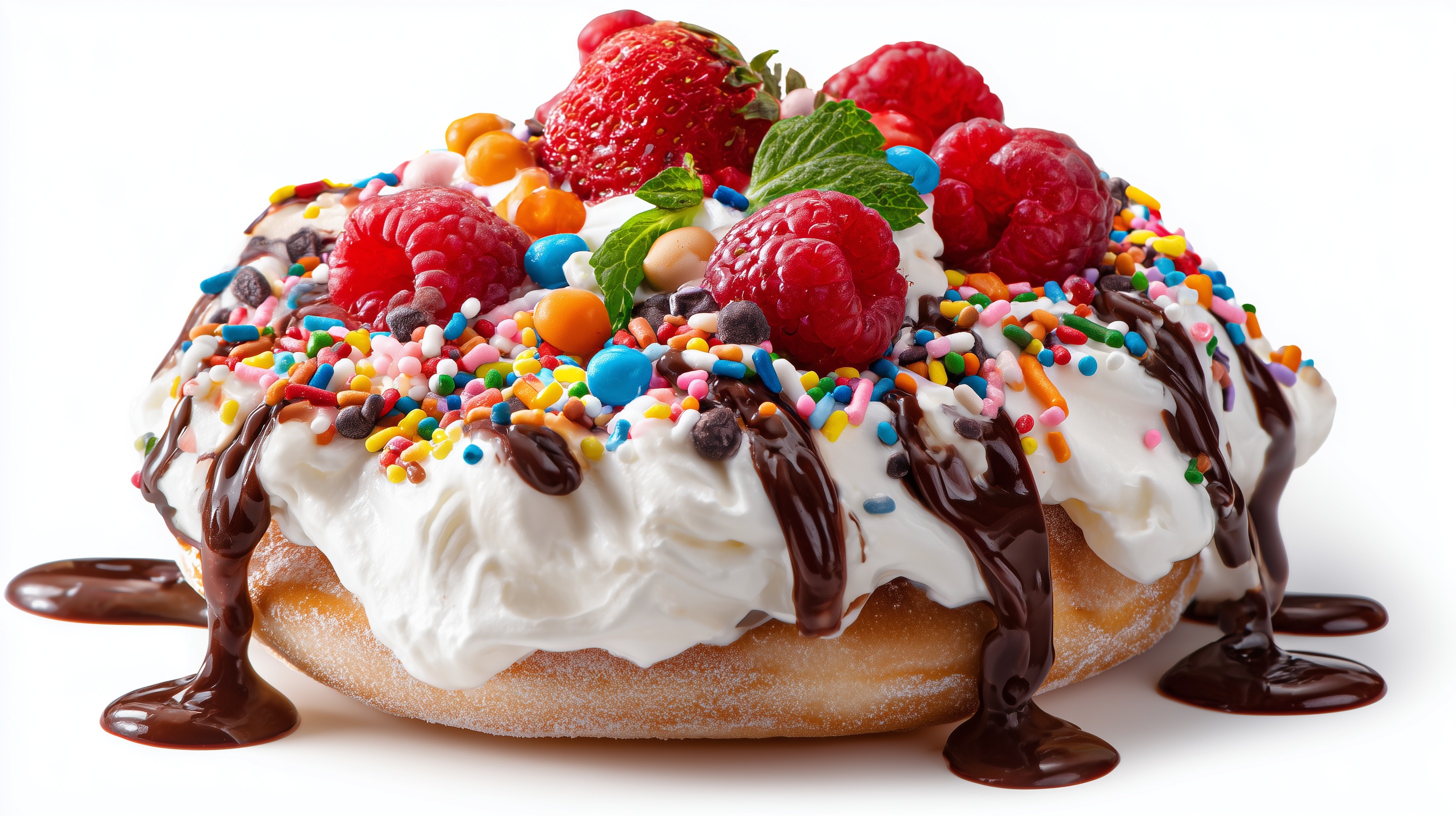 Dieser verlockende Kuchen ist ein wahrer Augenschmaus. Auf einer goldbraunen Kruste thronen üppig frische Erdbeeren, Himbeeren und weitere Beerenfrüchte, umhüllt von einer cremigen Sahnehaube. Darüber ergießen sich Schokoladenstreifen und bunte Zuckerstreusel, die dem Dessert eine fröhliche Note verleihen. Die sorgfältige Anordnung der Zutaten und die stimmungsvolle Beleuchtung erzeugen eine appetitliche, fast schon künstlerische Optik. Dieses Foto eignet sich hervorragend für Beiträge in Blogs, auf Social-Media-Kanälen oder in digitalen Präsentationen zum Thema Backen, Kochen und Genuss. Die farbenfrohe Gestaltung und das verlockende Erscheinungsbild wecken Appetit und Vorfreude auf den köstlichen Genuss.