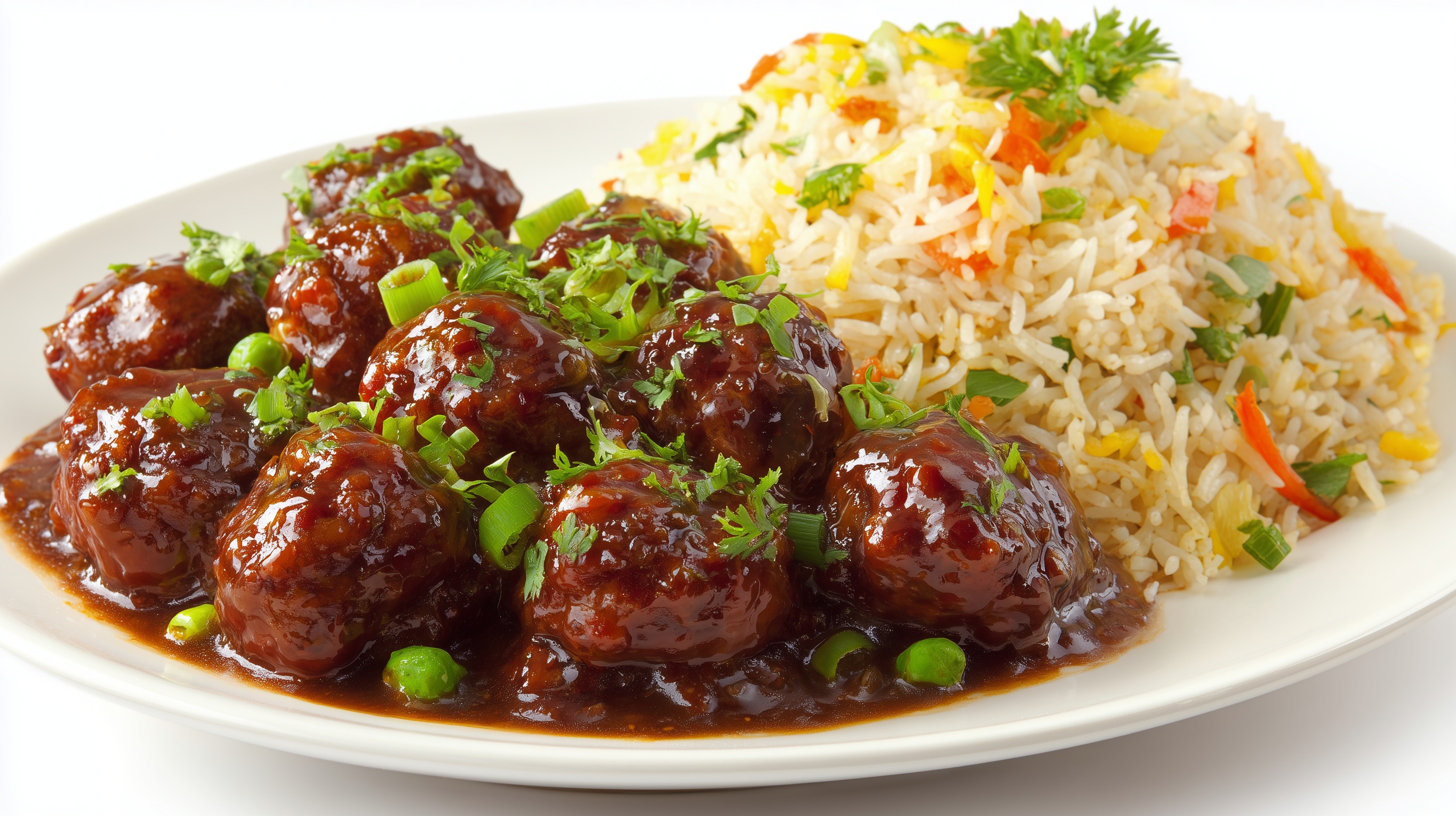 Das Bild zeigt ein köstliches asiatisches Fleischgericht, das auf einem weißen Teller angerichtet ist. Im Vordergrund sind saftige, dunkelbraune Fleischbällchen mit einer leckeren, glasierten Sauce zu sehen, die mit frischen Kräutern garniert sind. Daneben befindet sich eine bunte Portion Reis mit Gemüse wie Karotten, Zwiebeln und Kohl. Das Gericht strahlt eine appetitliche Optik aus und lässt auf einen aromatischen Geschmack schließen. Es eignet sich perfekt als Hauptspeise in einem asiatischen Restaurant oder Bistro, kann aber auch hervorragend für ein leckeres Mittagessen oder Abendessen zuhause zubereitet werden. Das Foto könnte ideal für Foodblogs, Kochbücher, Restaurantwebsites oder Social-Media-Beiträge rund um das Thema asiatische Küche eingesetzt werden.