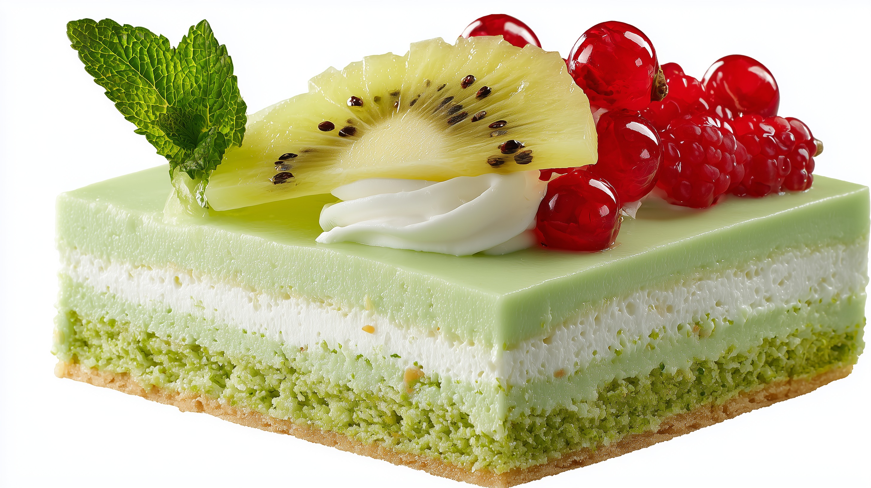Diese leckere Torte ist eine wahre Augenweide. Die sahnige, leicht grüne Creme bildet die Grundlage für eine fantasievolle Anordnung von frischen Früchten. Kiwischeiben, rote Preiselbeeren und eine Minzeblatt verleihen dem Dessert ein frisches, natürliches Aussehen. Die klare Präsentation auf weißem Hintergrund lässt die Farben und Formen besonders gut zur Geltung kommen. Dieses Foto eignet sich hervorragend für den Einsatz in Rezeptsammlungen, Kochblogs, Social-Media-Kanälen oder Präsentationen rund um leckere, gesunde Nachtische. Die ausgewogene Komposition und natürliche Ausstrahlung machen diese Torte zu einem vielseitigen Hingucker für jeden Genießer.