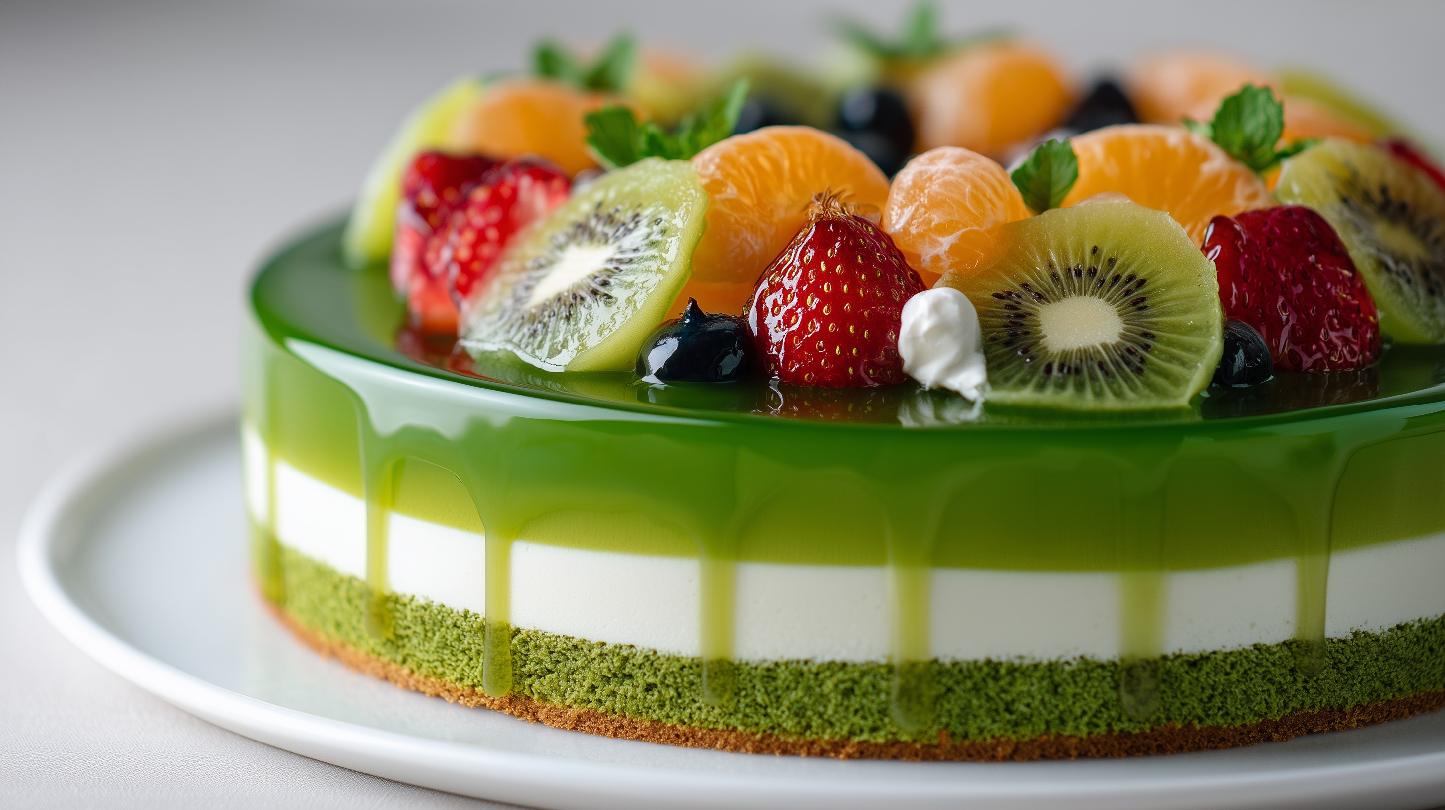 Dieses Foto zeigt einen dekorativen Obstkuchen mit einer Vielfalt an frischen, saftigen Früchten. Der Kuchen hat eine grüne Glasur, die perfekt zu den bunten Beeren, Kiwi-Scheiben und Mandarinen passt. Die Früchte sind geschickt auf dem Kuchen angeordnet und verleihen ihm einen natürlichen, appetitanregenden Look. Dieser Kuchen wäre nicht nur ein köstlicher Nachtisch, sondern auch ein echter Hingucker für jede Kaffeetafel, Gartenparty oder Geburtstagsfeier. Durch die hochwertigen Zutaten und die farbenfrohe Gestaltung eignet sich das Bild hervorragend als Fotovorlage für Blogs, Social-Media-Kanäle oder Werbematerialien im Bereich Ernährung, Gastronomie und Lebensmittel.