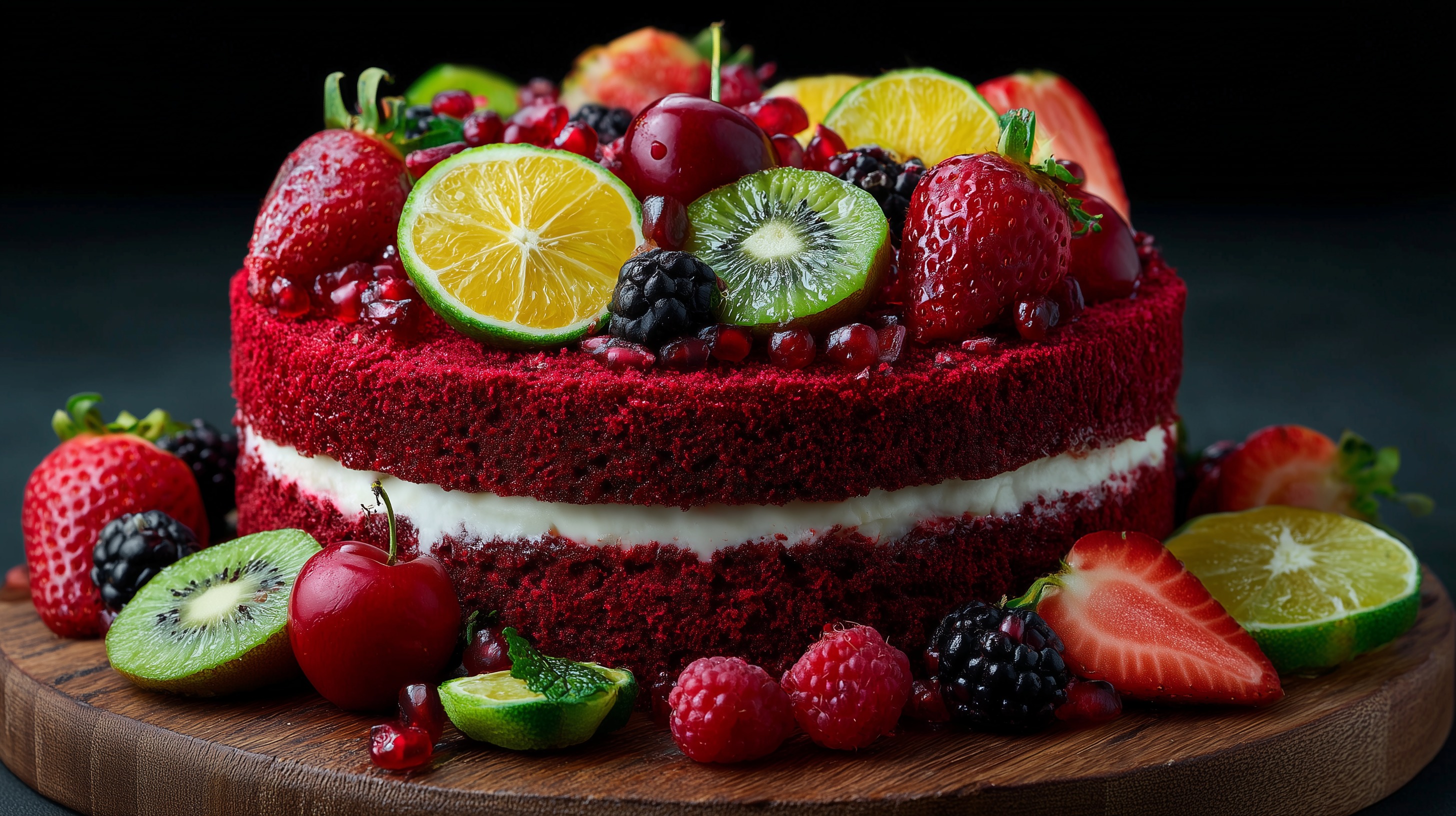 Die auffallende Torte auf dem Foto ist ein echter Blickfang. Der dunkelrote Tortenboden, möglicherweise aus Roter Velvet-Biskuit, ist mit einer cremigen Füllung überzogen und üppig mit frischen, bunten Früchten wie Erdbeeren, Himbeeren, Brombeeren, Kiwistreifen und Zitronenscheiben dekoriert. Das Ganze verleiht dem Dessert ein frisches, natürliches und äußerst appetitliches Erscheinungsbild. Diese Torte wäre ein echter Hingucker auf einem Buffet, einer Hochzeit oder Geburtstagsfeier und lässt das Wasser im Mund zusammenlaufen. Mit ihren leuchtenden Farben und der stilvollen Anordnung der Früchte ist sie nicht nur lecker, sondern auch ein echter Blickfang für Foto- und Videoproduktionen etwa in Lifestyle-Blogs, Social-Media-Kanälen oder Werbekampagnen rund um gesunde Ernährung und Genuss.