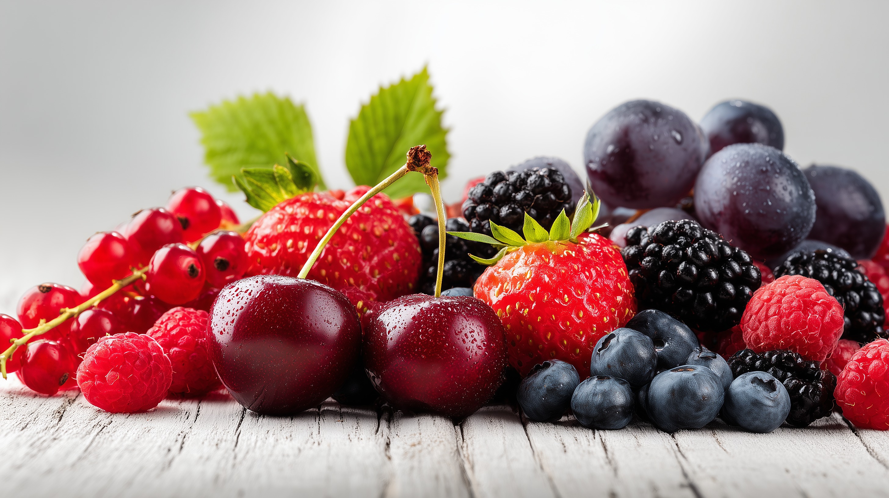 Das Foto zeigt einen bunten und appetitlichen Mix aus verschiedenen frischen Früchten und Beeren auf einem rustikalen Holzhintergrund. Im Vordergrund sind saftige, glänzende Erdbeeren, dunkelrote Kirschen, violette Himbeeren und Brombeeren zu sehen. Ergänzt werden sie durch blauschwarze Heidelbeeren und rote, glänzende Johannisbeeren. Die Früchte sind detailreich und in stimmungsvoller Beleuchtung fotografiert, was eine natürliche, appetitliche Wirkung erzeugt.