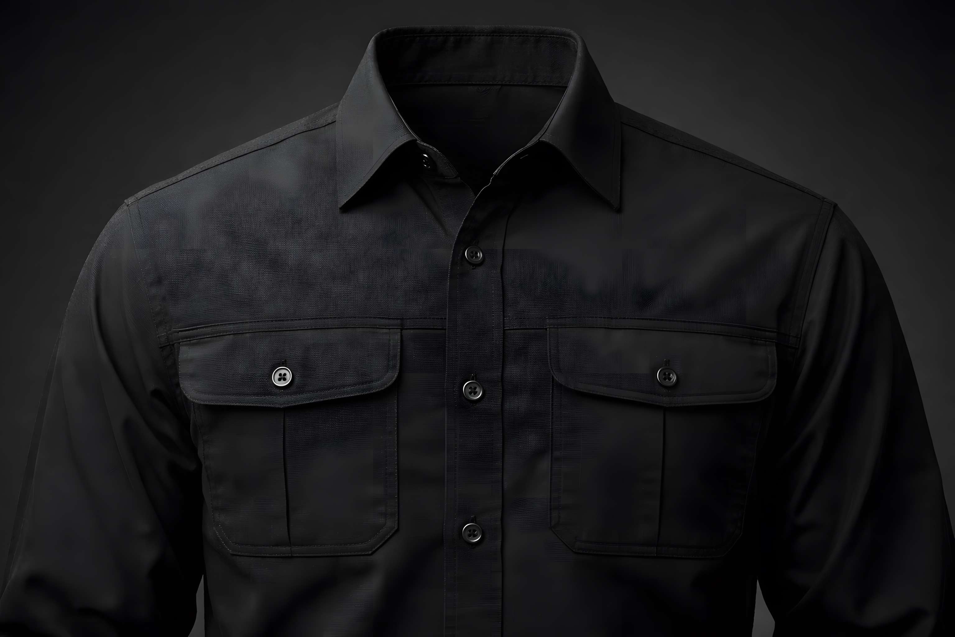 Das Foto zeigt ein dunkles, stilvolles Hemd mit zwei Brusttaschen und Knöpfen. Das minimalistisch gestaltete Oberteil ist in einem klassischen Schwarz gehalten, was einen maskulinen und professionellen Eindruck vermittelt. Die scharfe Beleuchtung und Dunkelheit des Hintergrunds lassen die Textur und Form des Hemdes besonders gut hervortreten. Diese Aufnahme könnte ideal für Präsentationen, Blogbeiträge oder Social-Media-Posts zum Thema Mode, Bekleidung oder Business-Attire verwendet werden. Das Foto bietet ein hochwertiges, detailliertes Produktbild für verschiedene Einsatzbereiche.