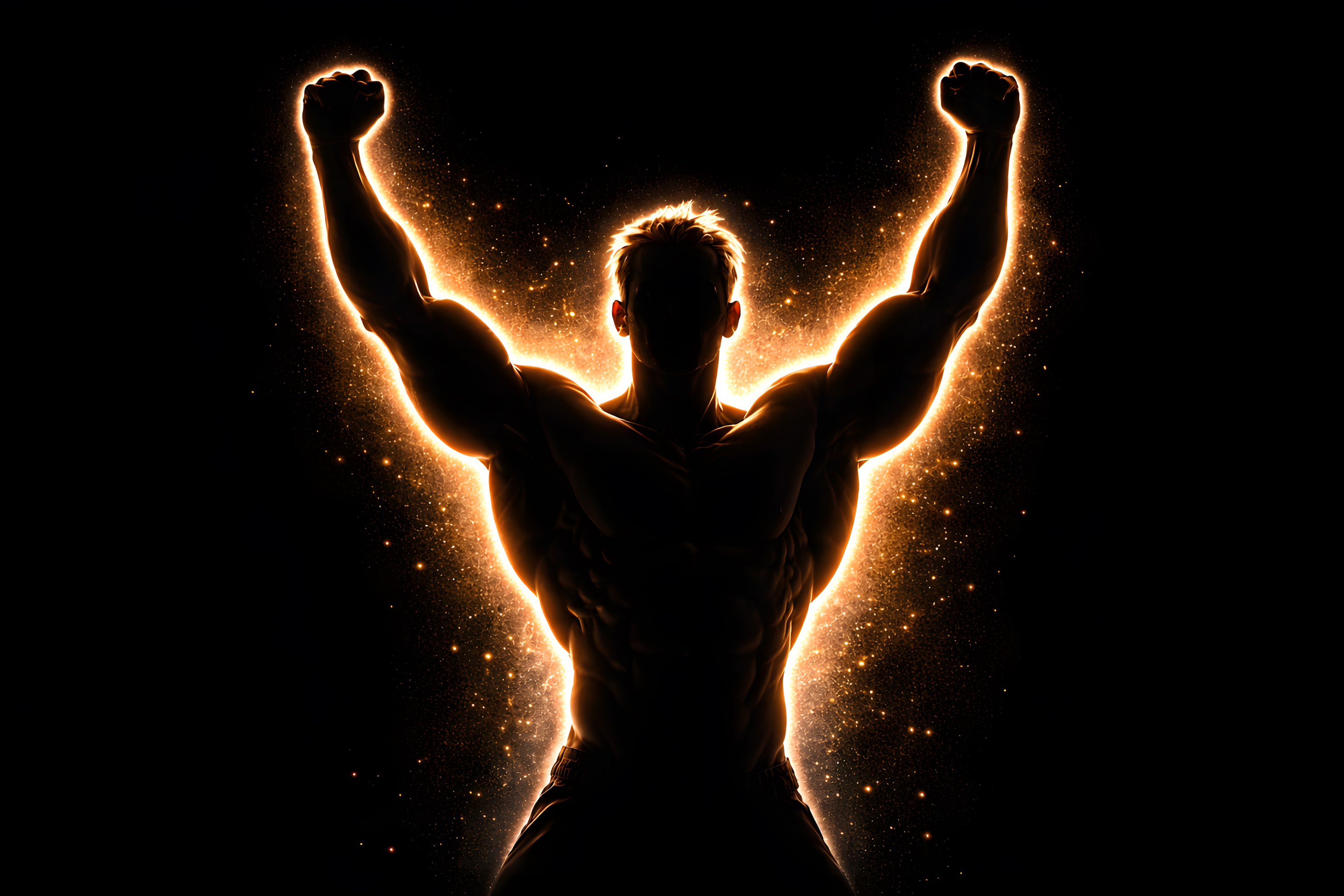 Das Foto zeigt eine kraftvolle, männliche Silhouette, die sich vor einem leuchtenden, funkelnden Hintergrund abhebt. Die Arme sind triumphierend in die Luft erhoben, als wäre der abgebildete Mann gerade dabei, einen Sieg zu feiern. Die Kontrastreiche Darstellung erzeugt einen dramatischen, fast mystischen Eindruck und strahlt pure Energie und Stärke aus.