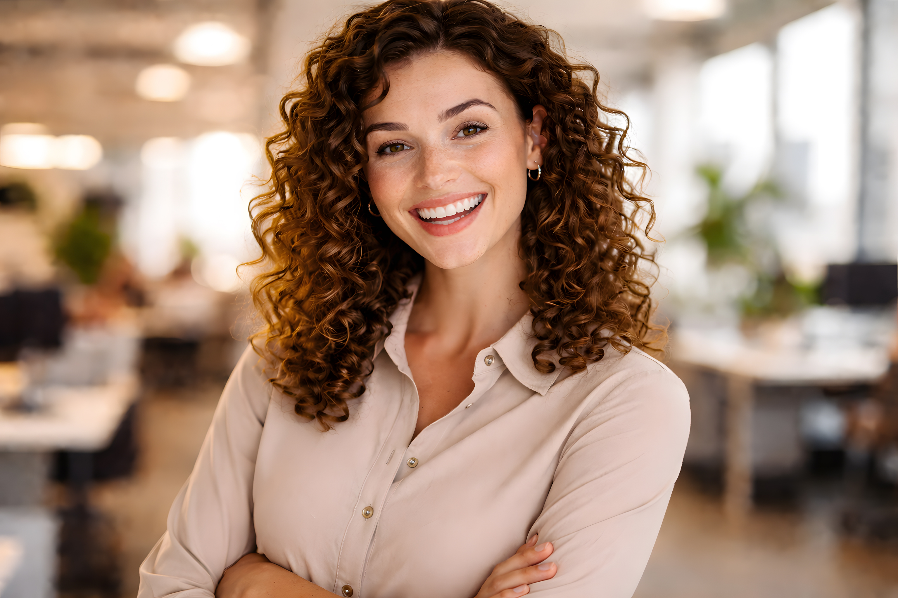 Das Foto zeigt eine junge Frau mit lockigem, braunem Haar, die in einer beigen Bluse lächelnd in die Kamera blickt. Ihr Gesichtsausdruck strahlt Freundlichkeit und Zufriedenheit aus. Die Perspektive der Aufnahme ist eine Nahaufnahme, die den Fokus auf das Gesicht der Frau legt. Die warmen, gedämpften Farbtöne verleihen dem Bild eine angenehme, professionelle Ausstrahlung.