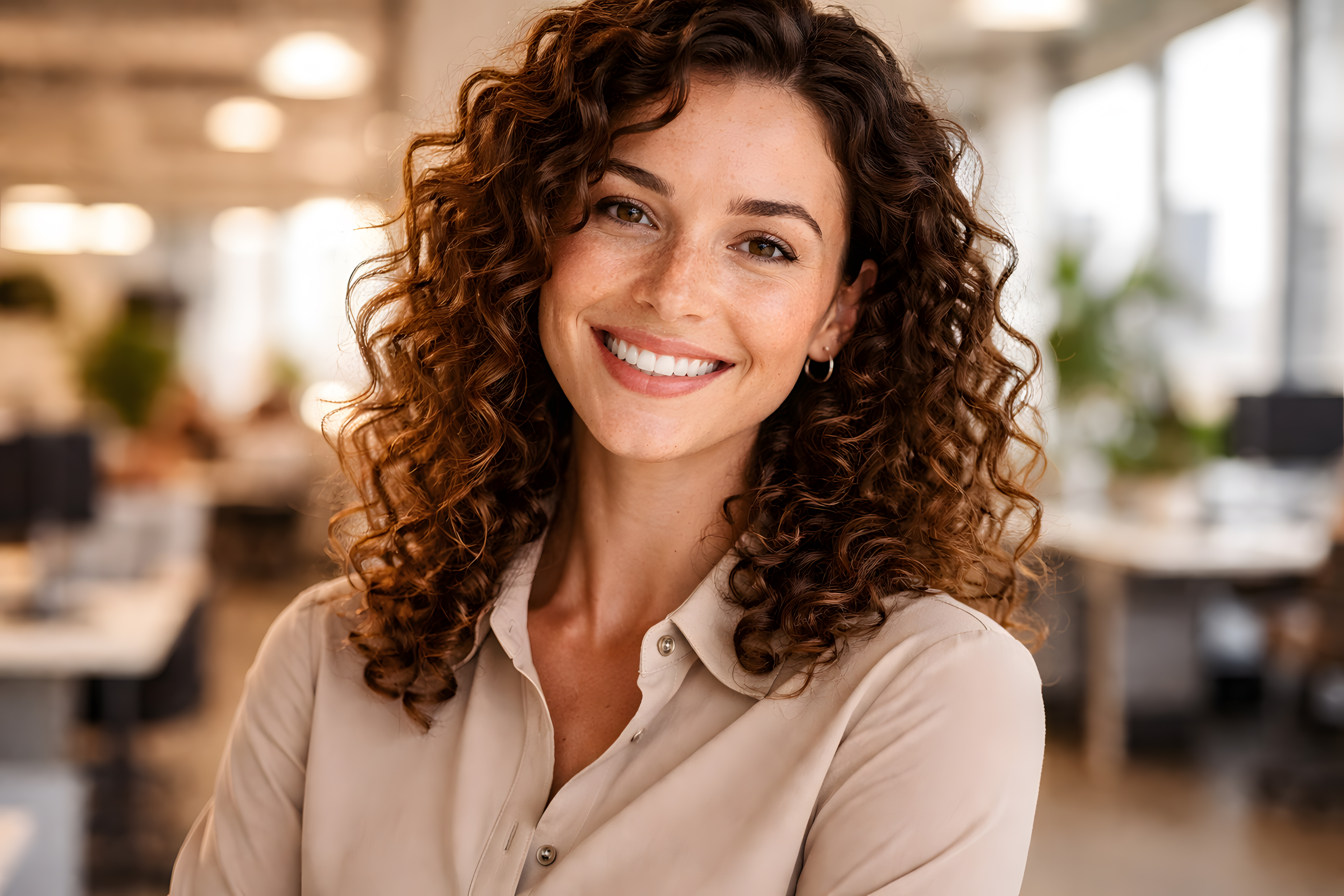 Das Foto zeigt eine Frau mit lockiger brauner Frisur, die strahlend in die Kamera lächelt. Sie trägt eine beige Bluse und sitzt in einem eleganten Büroraum, umgeben von hölzernen Möbeln und grünen Pflanzen. Das natürliche Licht, das durch die großen Fenster fällt, verleiht der Szene eine warme, einladende Atmosphäre. Dieses Bild könnte perfekt für Unternehmenswebsites, Werbematerialien oder Personalprofile eingesetzt werden, um eine professionelle, selbstbewusste und freundliche Ausstrahlung zu vermitteln. Die hochwertige Bildqualität und die sorgfältige Komposition machen es zu einem vielseitig einsetzbaren Stock-Foto für verschiedenste digitale und gedruckte Anwendungen.