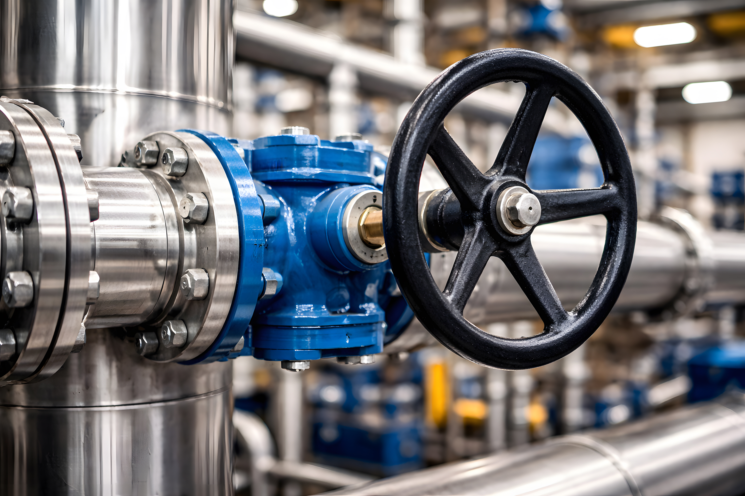 Das Bild zeigt eine mechanische Ventilarmatur in einer industriellen Umgebung. Die Armatur ist blau lackiert und hat einen schwarzen Ventilhebel, der zum Öffnen und Schließen des Ventils verwendet wird. Die Ventilkugel ist aus Metall und glänzt in Silber- und Chromtönen, was auf eine hochwertige Verarbeitung hindeutet.