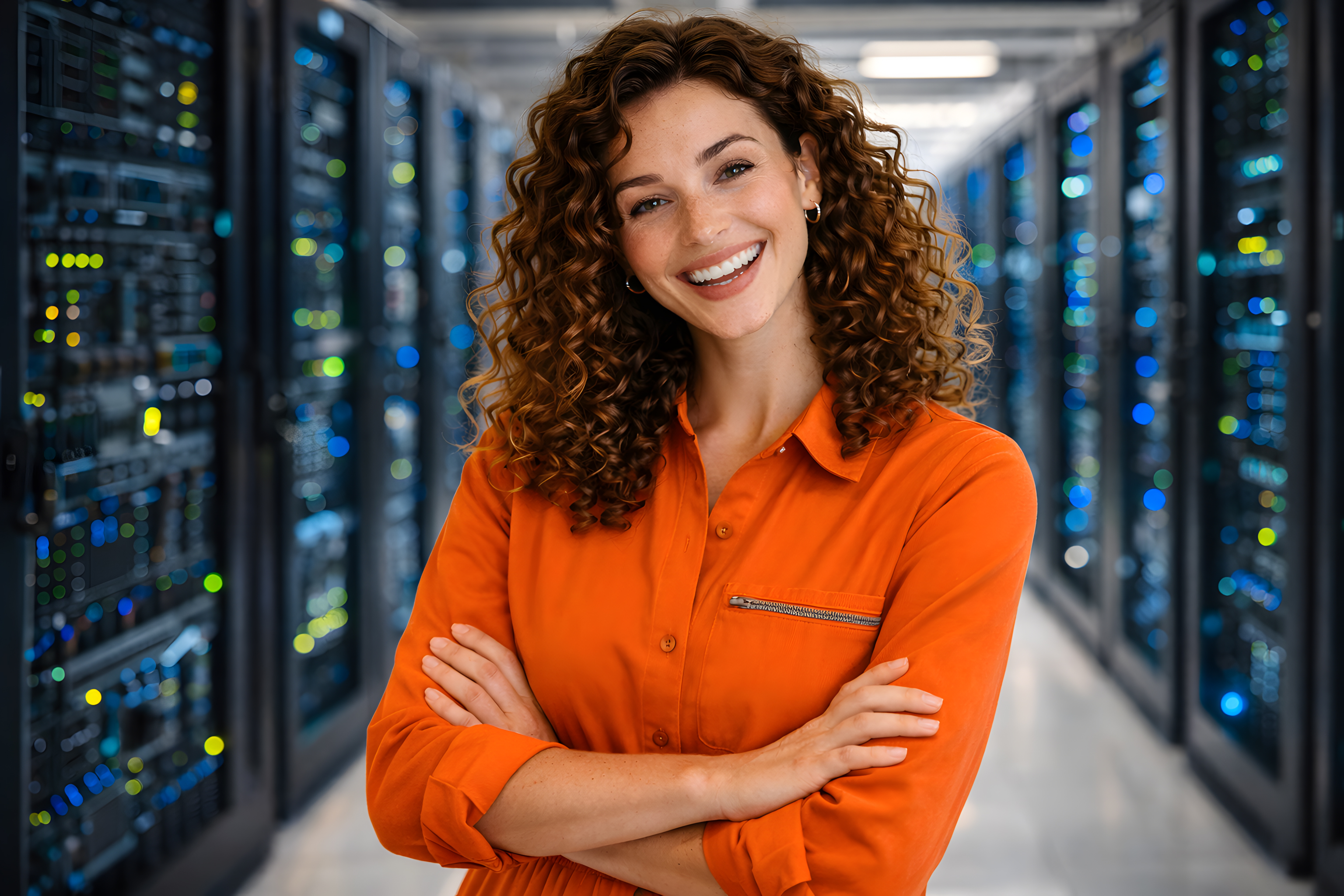 Das Foto zeigt eine attraktive Frau mit lockigem, braunem Haar, die in einem modernen Serverraum posiert. Sie trägt ein orangefarbenes Hemd und blickt lächelnd in die Kamera, ihre Arme sind vor der Brust verschränkt. Der Hintergrund ist geprägt von leuchtenden Bildschirmen und Netzwerkausrüstung, was den Eindruck einer innovativen Technologieumgebung vermittelt. Dieses Bild könnte für Unternehmensprofile, Karriereseiten oder Präsentationen zu den Themen IT, Digitalisierung oder Technologiebranche eingesetzt werden. Es strahlt Professionalität, Kompetenz und eine positive Grundstimmung aus.