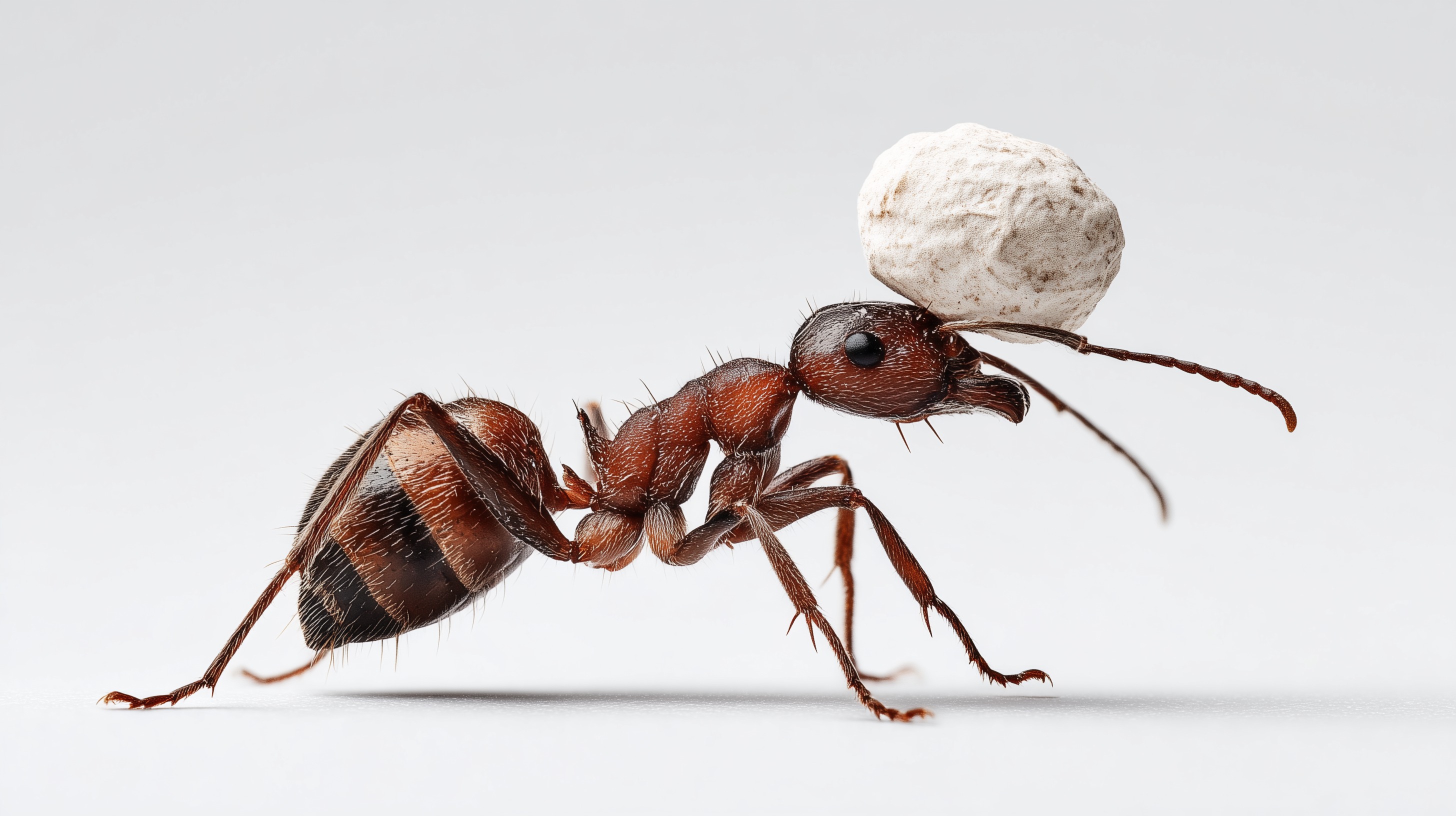 Dieses faszinierende Foto zeigt eine detaillierte Nahaufnahme einer braunen Ameise, die eine beachtliche Last mit sich trägt. Die Kamera hat den Fokus präzise auf den Körper des Insekts gesetzt, wodurch die faszinierende Struktur und Textur seines Exoskeletts deutlich hervortritt. Der minimalistische, weiße Hintergrund lenkt die gesamte Aufmerksamkeit auf das Hauptmotiv und verleiht dem Bild eine konzeptionelle, fast grafische Anmutung.