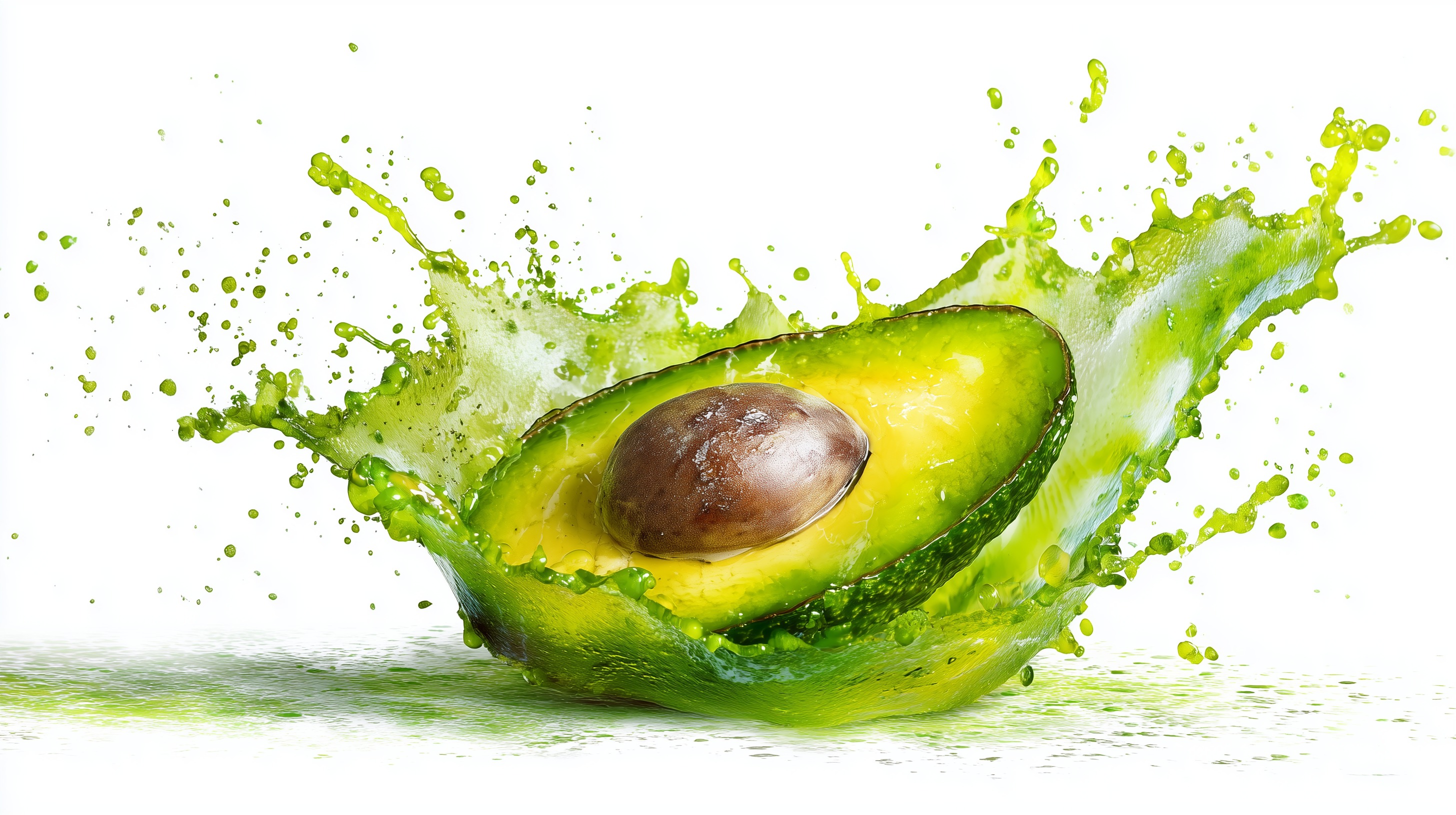 Das Foto zeigt eine aufgeschnittene, reife Avocado, die von einem spritzigen, grünen Flüssigkeitsstrahl umgeben ist. Die Frucht liegt auf einer spiegelnden Oberfläche und ist vor einem weißen Hintergrund platziert, der den Fokus voll und ganz auf das Motiv lenkt. Die Farben sind leuchtend und frisch, die Komposition symmetrisch und ausgewogen. Das Bild vermittelt eine sinnliche, appetitliche Anmutung und lässt den Betrachter die Textur und den Geschmack der Avocado förmlich spüren.
