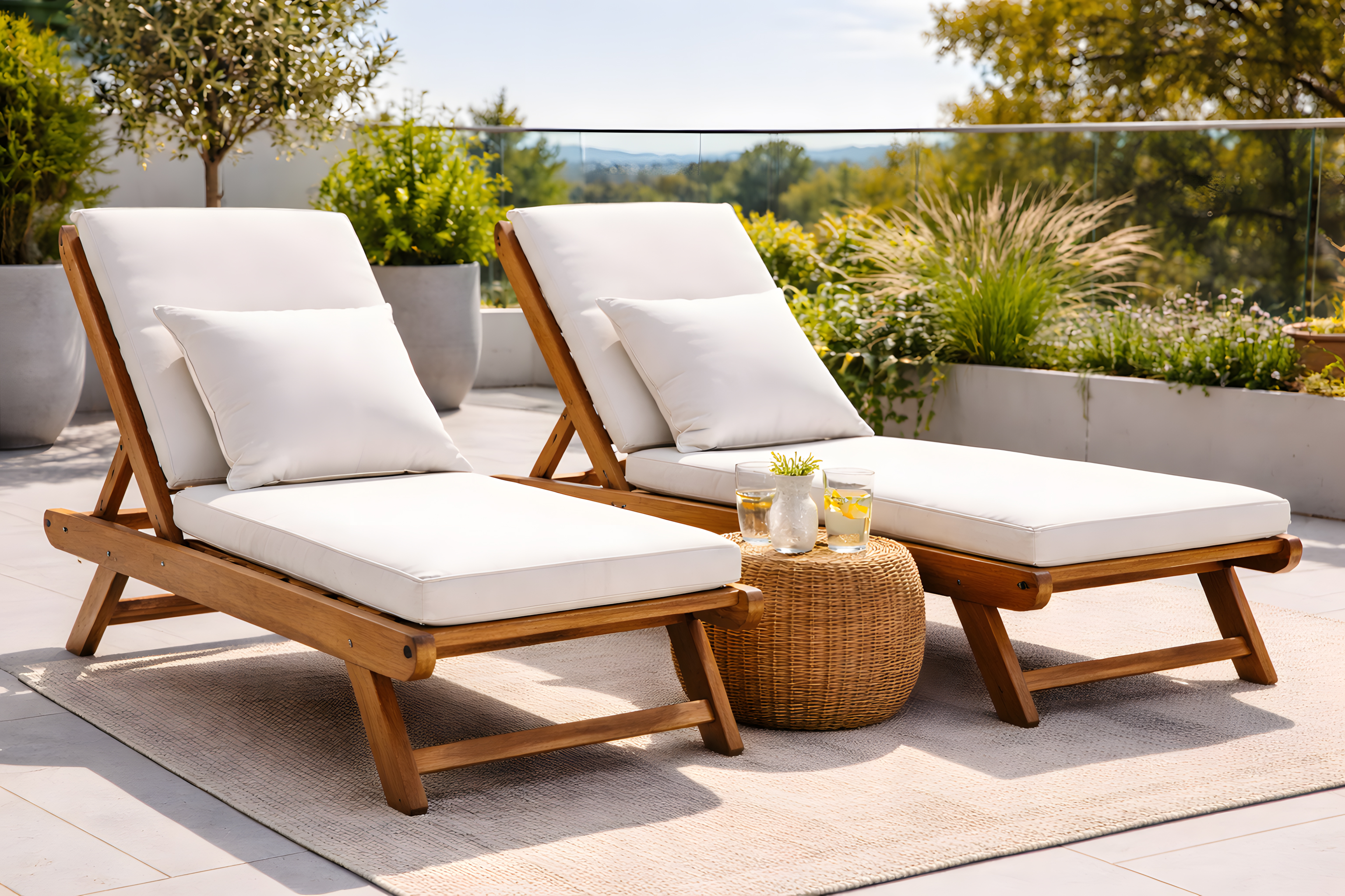 Dieses Foto zeigt einen einladenden Außenbereich mit modernen Loungemöbeln in einer natürlichen Gartenumgebung. Zwei weiße Liegestühle mit bequemen Polstern stehen auf einer Terrasse, umgeben von grünen Pflanzen und Bäumen. Dazwischen befindet sich ein niedriger Tisch, auf dem Getränke sowie eine dekorative Vase mit Blumen platziert sind. Die Möbel sind aus hellem Holz gefertigt und verleihen dem Ambiente eine warme, einladende Atmosphäre.