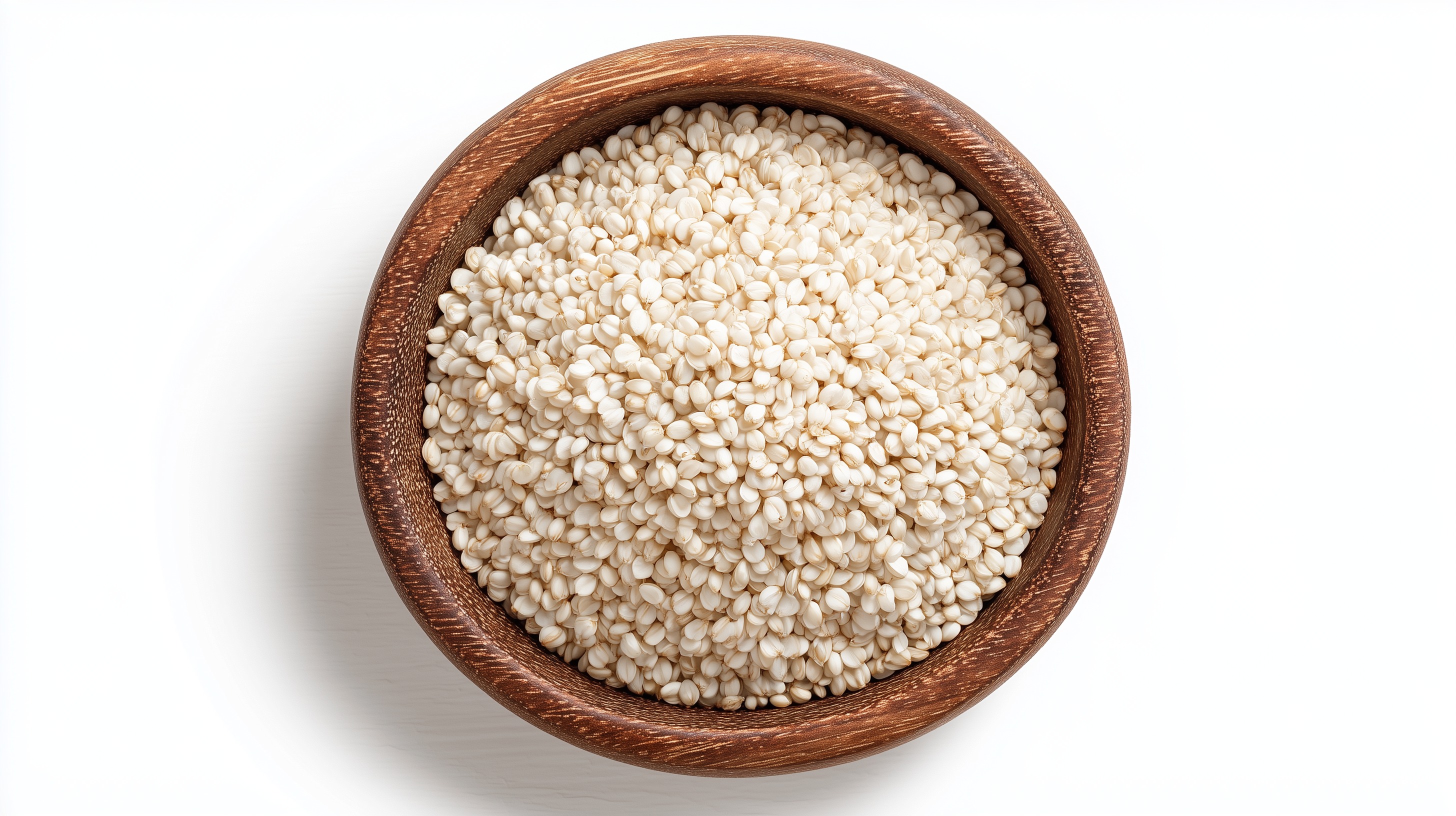 Das Foto zeigt eine Schüssel voller körniger, weißer Reiskörner auf einem neutralen weißen Hintergrund. Die Reiskörner sind in einer runden, hölzernen Schüssel angeordnet, die dem Foto eine natürliche, schlichte Optik verleiht. Reis ist ein wichtiger Bestandteil in vielen asiatischen Gerichten und wird aufgrund seiner Nährstoffe und Ballaststoffe auch in der westlichen Küche zunehmend geschätzt. Das Bild eignet sich hervorragend für Rezepte, Kochbücher, Lebensmittel-Blogs oder Social-Media-Posts rund um die Themen gesunde Ernährung, vegetarisches und veganes Kochen sowie orientalische Küche. Der minimalistisch-natürliche Stil passt auch zu Präsentationen, Verpackungsdesigns oder Newsletter-Beiträgen mit den Schwerpunkten Nachhaltigkeit und Authentizität.