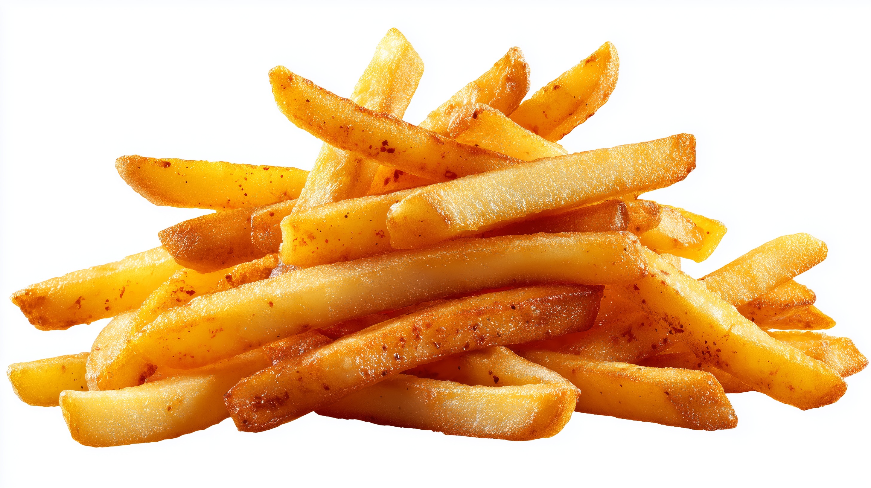 Das Foto zeigt eine Portion köstlicher, knuspriger Pommes frites auf weißem Hintergrund. Die goldgelben Kartoffelstäbchen sind appetitlich angerichtet und sprühen förmlich vor Frische. Die intensive Färbung und das knusprige Aussehen der Pommes lassen den Betrachter direkt Lust auf einen Snack bekommen. Mit ihrer typischen Form und der einladenden Präsentation eignen sich die Pommes frites hervorragend für den Einsatz in Lebensmittelwerbung, Foodfotografie oder Gastronomie-Präsentationen. Auch in Blogbeiträgen, Social-Media-Posts oder Newsletter-Designs kommen die leckeren Kartoffelstäbchen sehr gut zur Geltung.