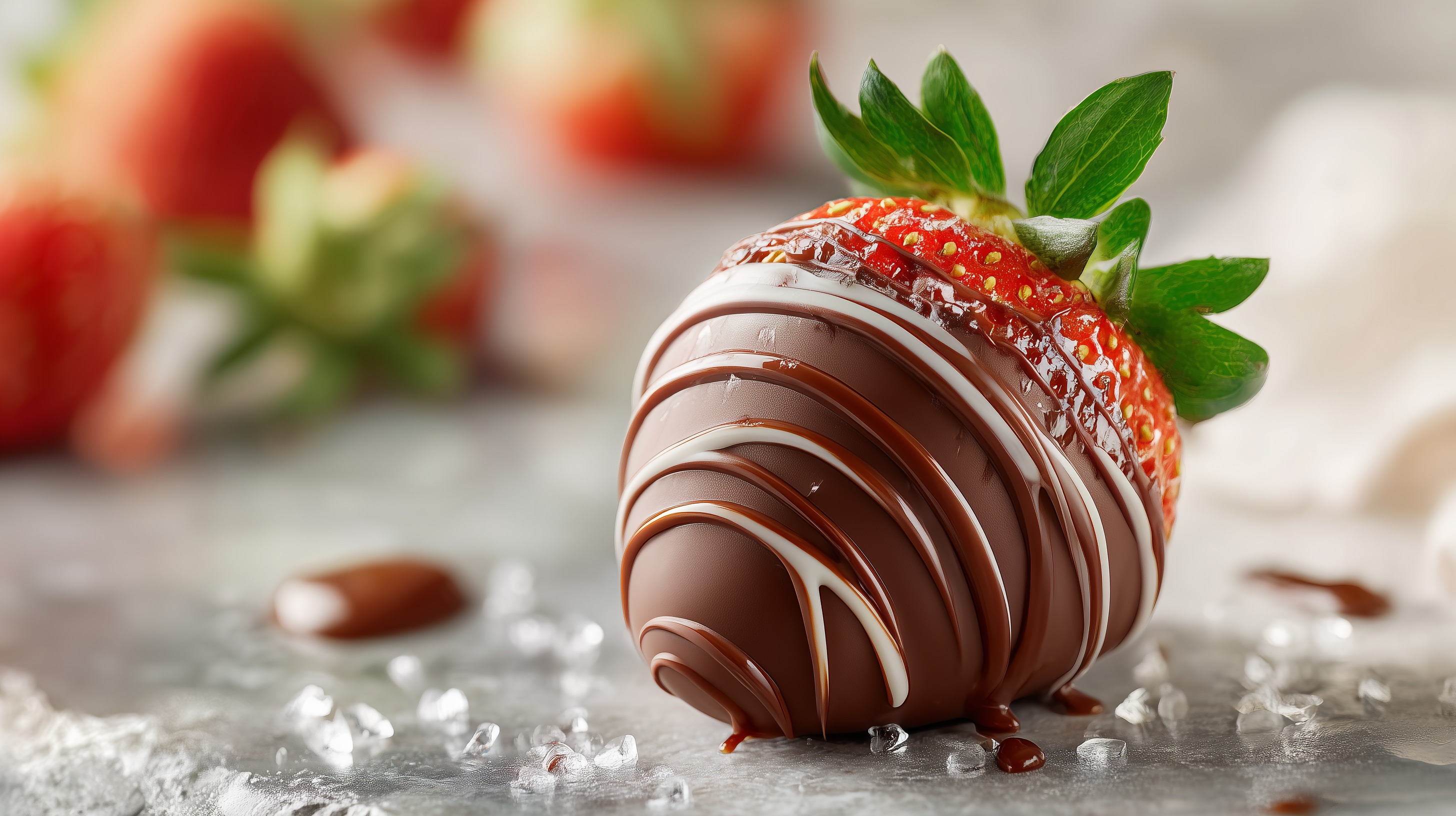Das Foto zeigt eine einzelne Erdbeere, die in dunkle Schokolade getaucht und dann mit feinen, grünen Minzeblättern verziert wurde. Die glänzende, rote Frucht wird von der glänzenden, dunklen Schokolade umhüllt, was einen reizvollen Kontrast schafft. Die Komposition ist sorgfältig arrangiert, mit Wassertropfen, die auf der Oberfläche glitzern und den Eindruck von Frische vermitteln. Diese Leckerei könnte als dekoratives Element in Desserts, auf Torten oder in kreativen Lebensmittelfotos verwendet werden. Sie strahlt Genuss, Luxus und Sinnlichkeit aus und wäre ein perfekter Hingucker für einen Blog-Beitrag über Schokolade, Desserts oder Feinschmeckerrezepte.