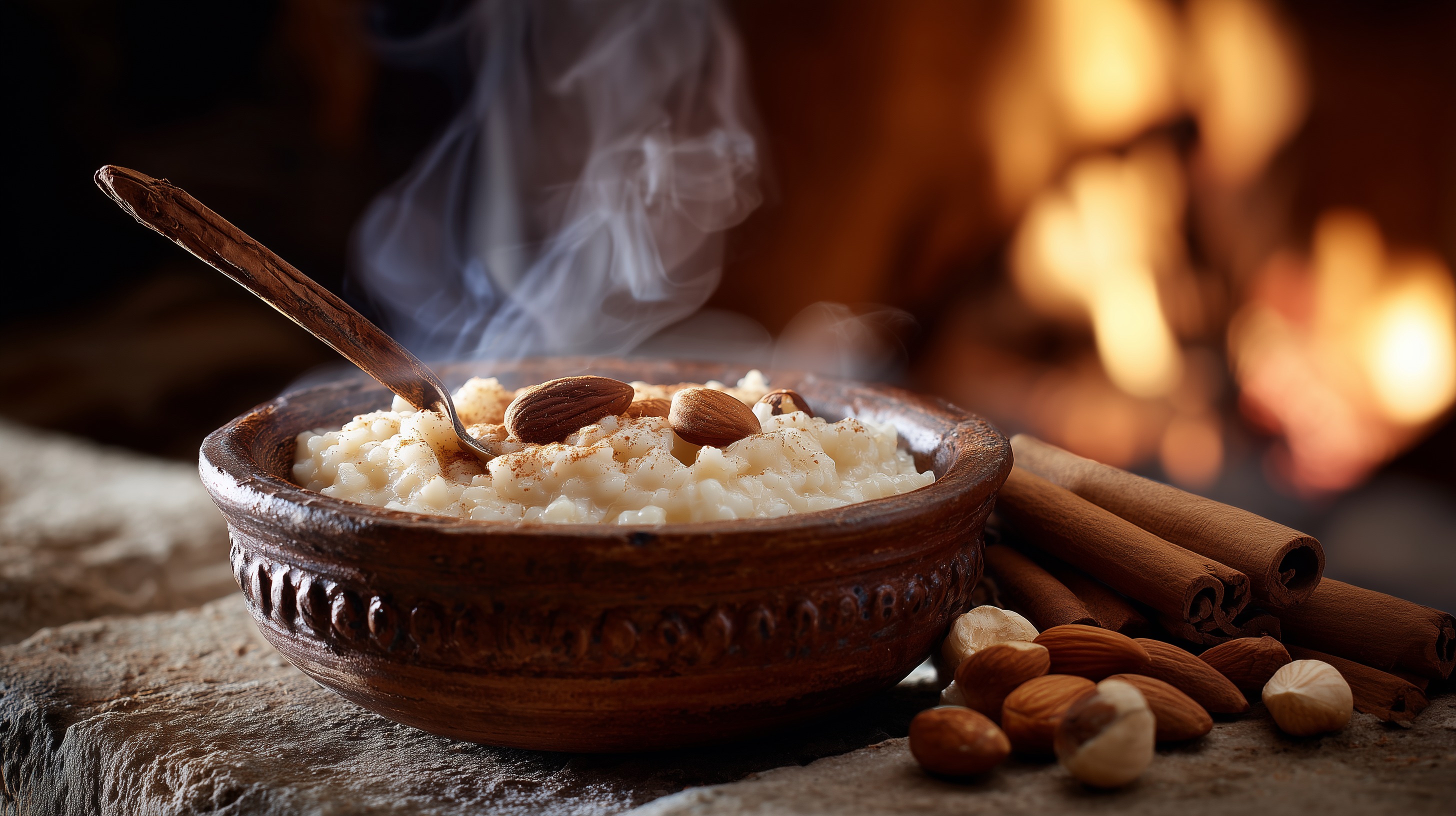 Das Foto zeigt eine dampfende Schüssel mit cremigen Haferflocken, die mit gerösteten Mandeln garniert sind. Die Schüssel steht auf einem rustikalen Holztisch, vor einem prasselnden Kamin, der eine angenehm warme und gemütliche Stimmung erzeugt. Die Nahaufnahme und der Fokus auf die Zutaten lenken die Aufmerksamkeit auf die Hauptzutat - die nährstoffreichen Haferflocken.