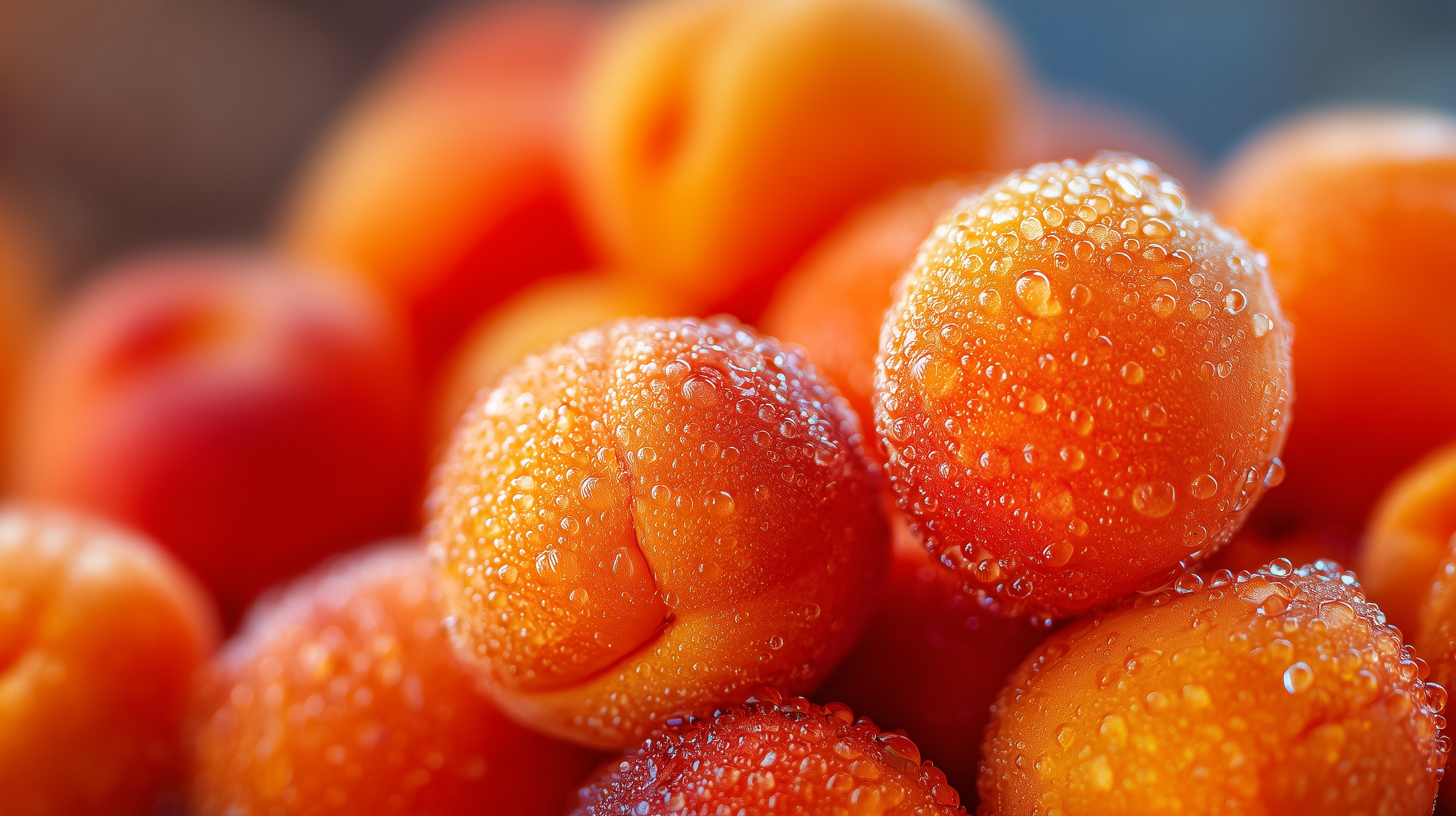 Dieses eindrucksvolle Foto zeigt eine Reihe saftiger und glänzender Mandarinen, die vor einem verschwommenen, blauen Hintergrund platziert sind. Die Früchte sind mit zarten Wassertropfen bedeckt, was ihnen einen frischen und appetitlichen Look verleiht. Das intensive Orange der Mandarinen bildet einen auffallenden Kontrast zu dem tiefen Blau des Hintergrunds und hebt die Früchte gekonnt hervor. Die detailreiche Nahaufnahme lässt die Struktur und Textur der Mandarinenschalen deutlich erkennen. Dieses Bild eignet sich perfekt für den Einsatz in Lebensmittel-Blogs, auf Social-Media-Kanälen oder in Präsentationen zum Thema gesunde Ernährung und Zitrusfrüchte. Die Kombination aus kräftigen Farben, der natürlichen Optik und dem hohen Detailgrad machen es zu einem vielseitig einsetzbaren Foto.