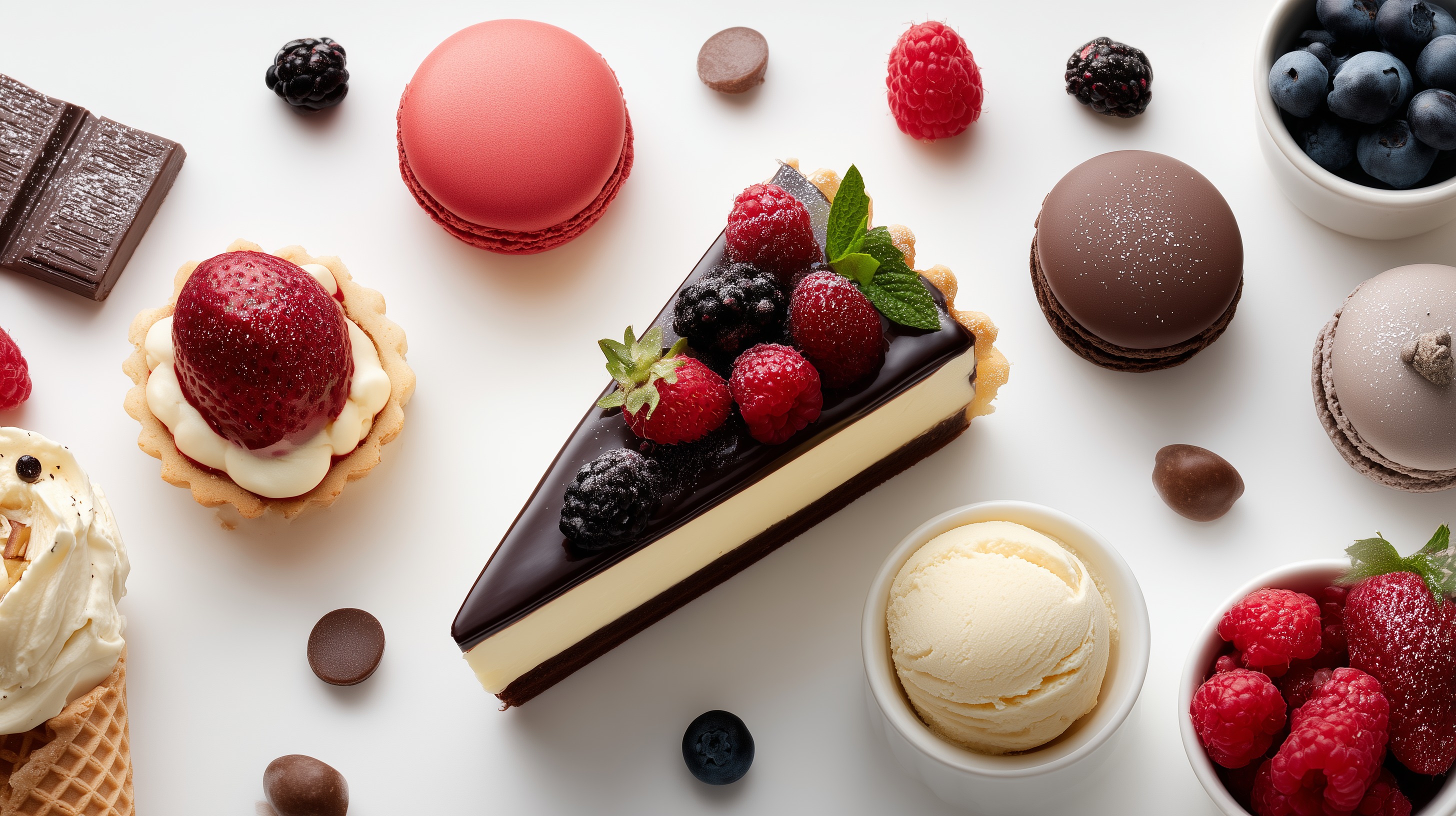 Das Foto zeigt eine verlockende Auswahl an süßen Leckereien. In der Mitte ist eine Torte mit glänzender Glasur und frischen Beeren zu sehen, umgeben von bunten Macarons, Erdbeertörtchen, Schokoladentrüffeln und einer Kugel Eis. Die Anordnung der Elemente ist stilvoll und die Farben harmonisch aufeinander abgestimmt. Dieses Foto eignet sich hervorragend für Beiträge zum Thema Patisserie, Gastronomie oder Genuss. Es könnte in Rezepten, auf Produktseiten oder in Lifestyle-Artikeln eingesetzt werden, um Appetit auf süße Köstlichkeiten zu machen. Die hochwertige Bildqualität und das professionelle Food-Styling machen es zu einem attraktiven visuellen Element für Blog-Beiträge, Social-Media-Posts oder Präsentationen rund um das Thema Kulinarik.